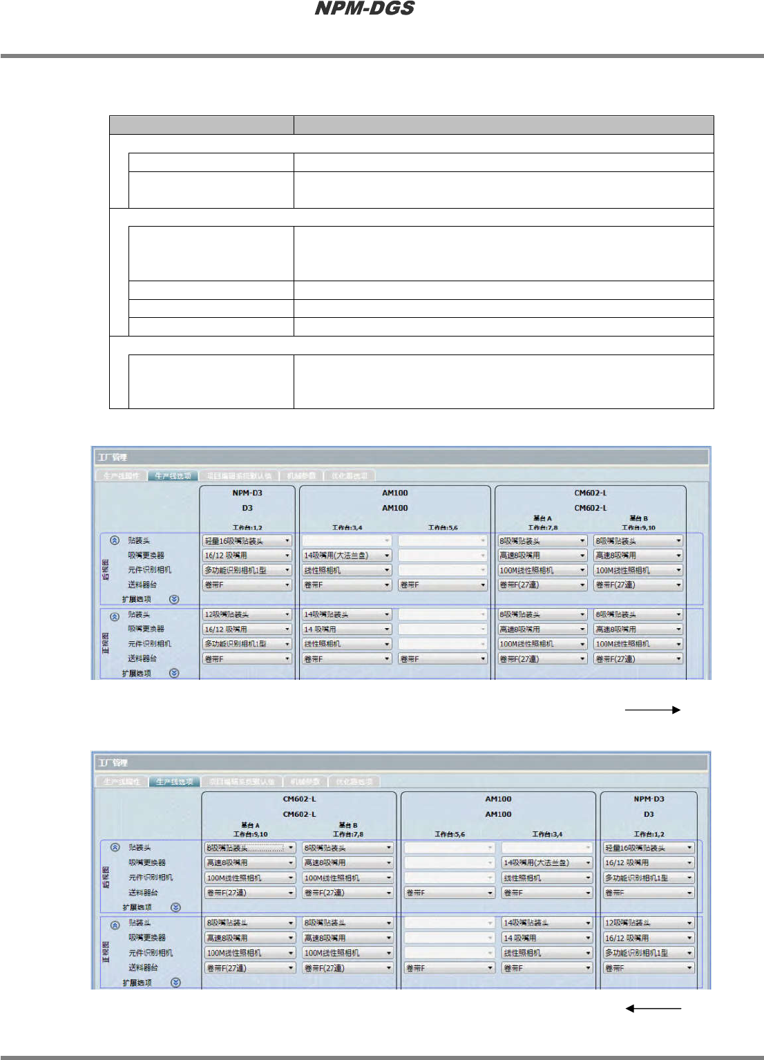 设定基板的搬送方向。根据基板搬送方向的设定,生产线选项卡画面