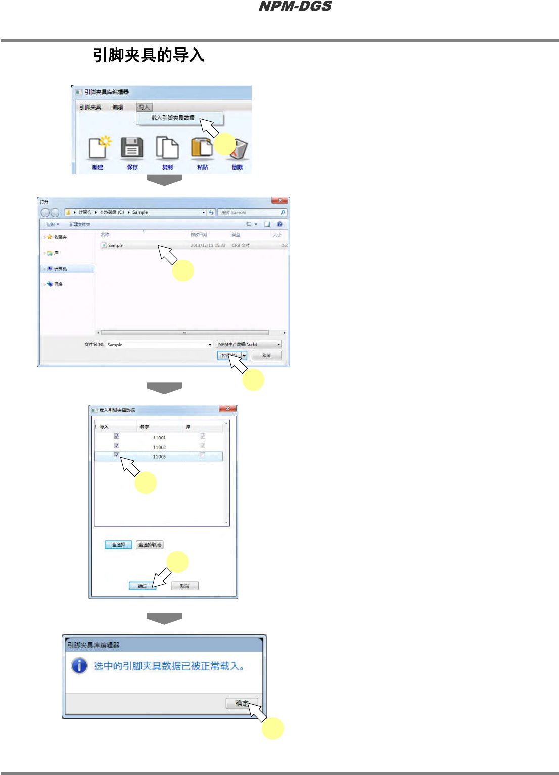 程序手册 4.9 引脚夹具库编辑器 EJS9AC-MB-04P-21 Page 4-103 4.9.7 1 选择菜单栏的 [ 导入 ] → [ 载入引脚夹具 数据 ] 。 2 选择需要导入的生产数据。 3 点击 [ 打开 ] 。 · 将显示确认画面。 4 勾选需要导入的引脚夹具。 5 点击 [ 确定 ] 。 6 点击 [ 确定 ] 。 Factory041100S-20C00 4 5 Factory041100S-21C00 6 Fac…