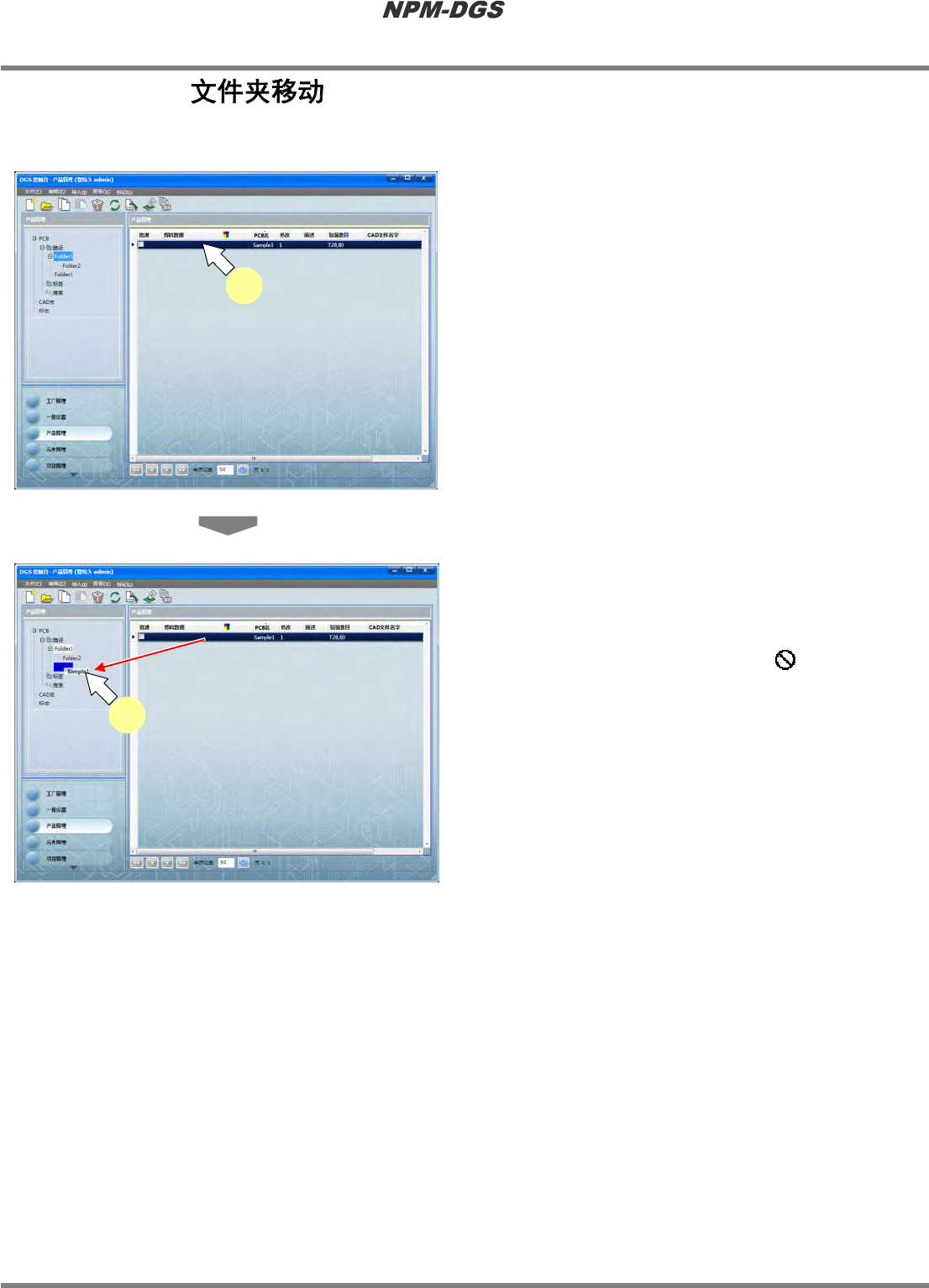 程序手册 5.1 概要 Page 5-10 EJS9AC-MB-05P-20 5.1.6 PCB / 可通过拖放方式移动 PCB 、文件夹。 ① PCB 的移动 1 选择需要移动的 PCB 。 2 拖放到移动目的地的文件夹内。 · PCB 将移动到移动目的地 的文件夹内。 * 无法移动的场所或文件 夹, 光标以 显示 。 Project050102S-10C00 1 Project050102S-11C00 2
