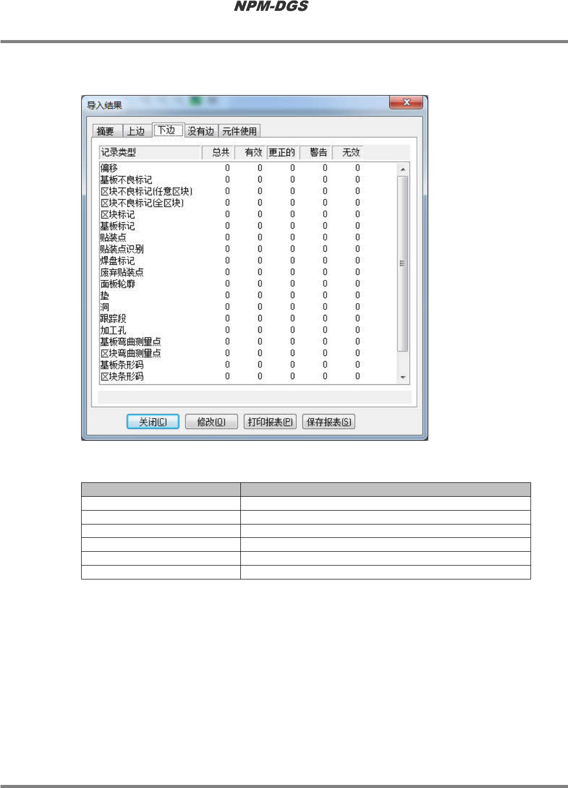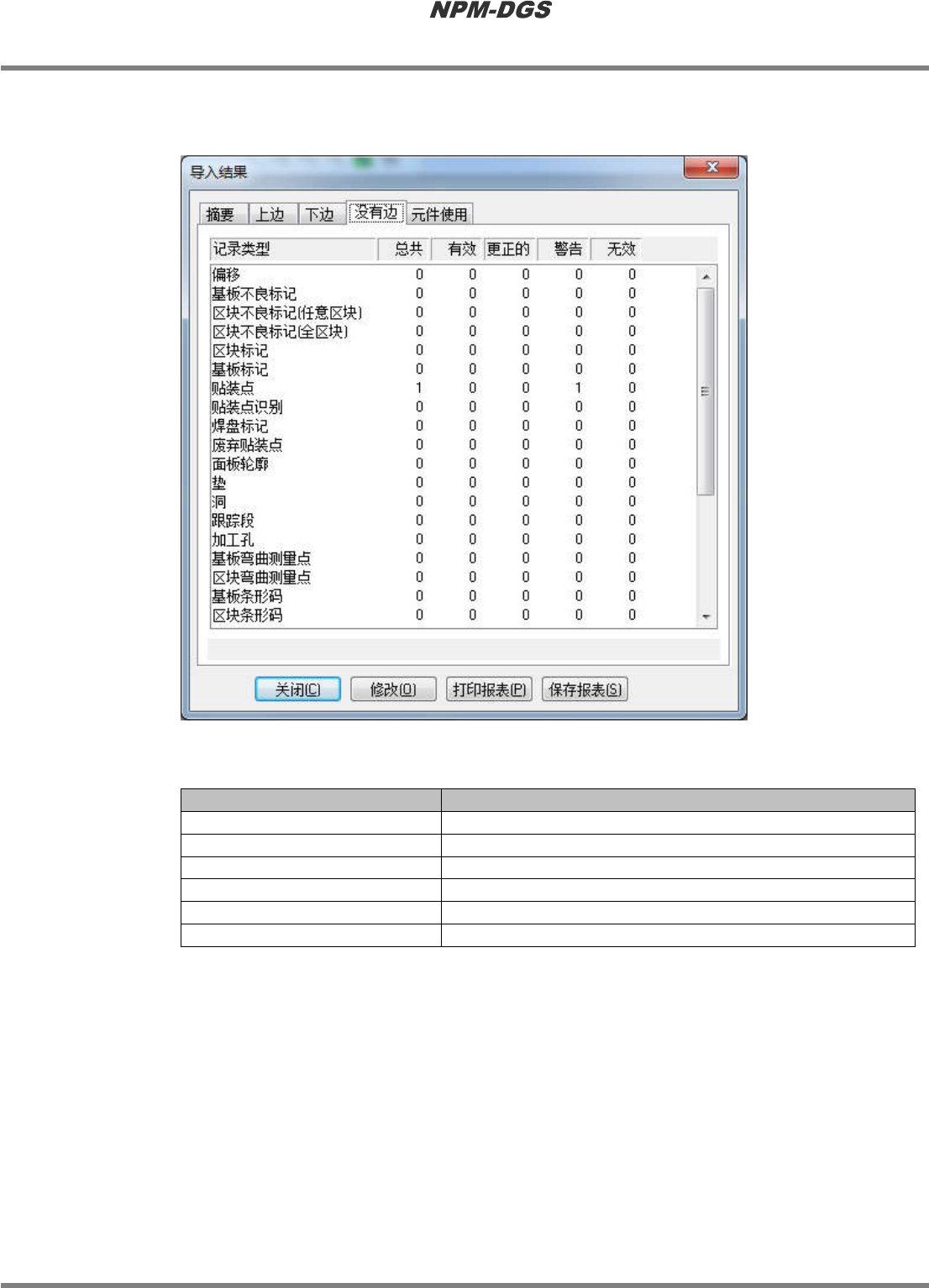程序手册 5.3 CAD/BOM 文件的导入 Page 5-94 EJS9AC-MB-05P-20 ③ 反面标签 只显示基板反面的记录。 n 显示项目 项目 说明 ‘ 记录类型 ’ 显示导入中的 CAD 宏的所有记录类型 。 ‘ 总共 ’ 显示各记录类型当中的 记录的合计。 ‘ 有效 ’ 显示各记录类型当中的 有效记录的合计。 ‘ 更正的 ’ 显示各记录类型当中的 被正确修改的记录的合计。 ‘ 警告 ’ 显示各记录类型当中的 警告记…