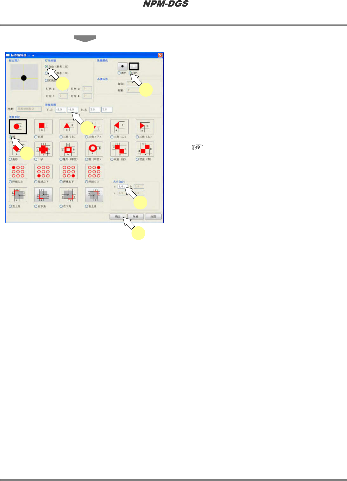 程序手册 5.7 标记的设定 Page 5-124 EJS9AC-MB-05P-20 6 在 ‘ 选择形状 ’ 中选择形状。 7 在 ‘ 大小 ’ 栏中输入形状的大小。 8 在 ‘ 灯泡控制 ’ 中选择基板标记的识别模 式。 * 选择手动时,请输入照 明值。在通常状态下, 在设备上进行照明值的 示教,然后决定。 ( 详细内容,请参照设备使 用说明 书。 ) 9 在 ‘ 选择颜色 ’ 中选择标记的颜色。 * 标记的颜色比周边的颜 色浓时,…