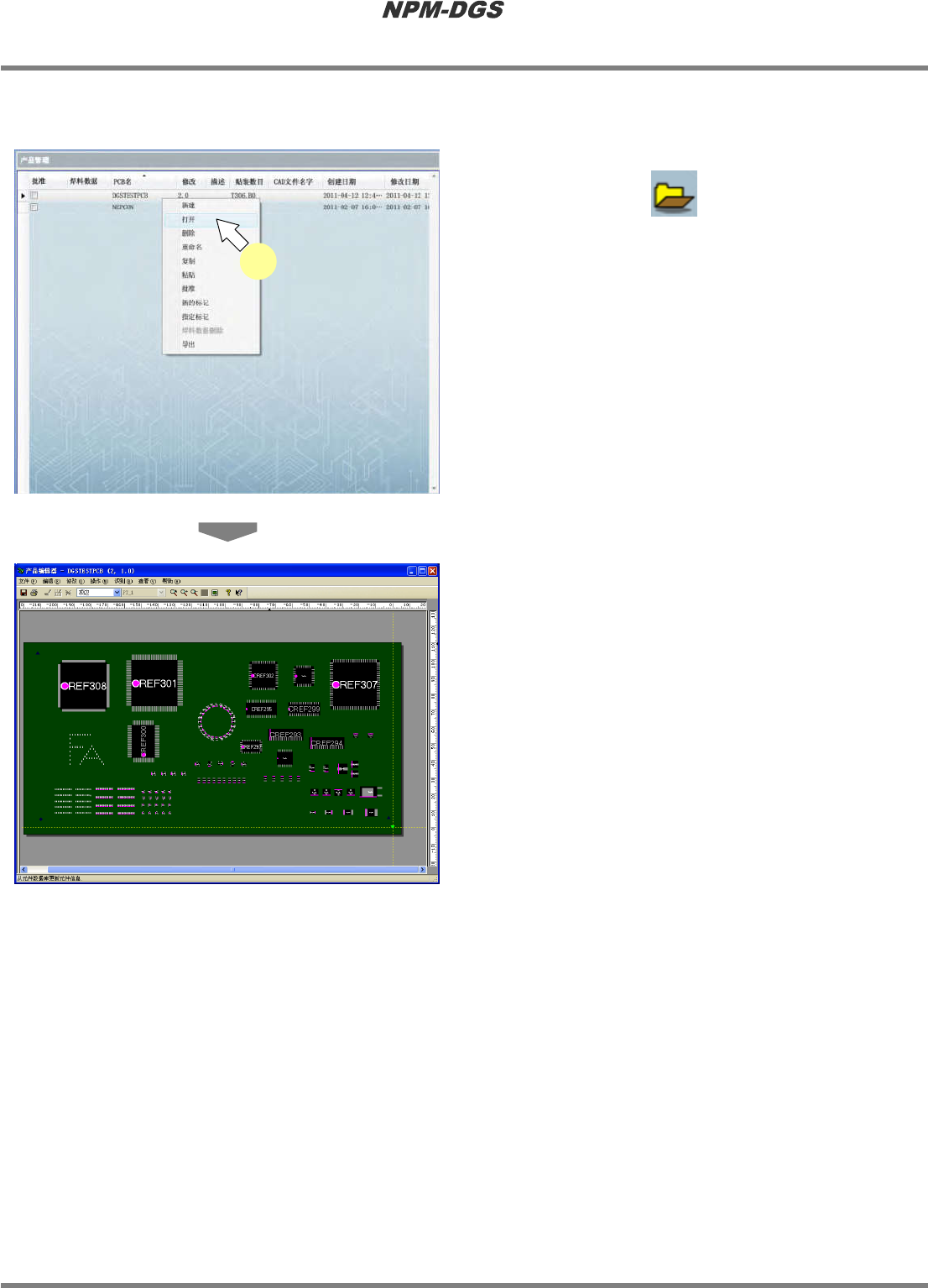 程序手册 5.8 PCB 编辑 Page 5-134 EJS9AC-MB-05P-20 n 编辑现存 PCB 1 在 PCB 一览表中选择已登录的 PCB , 点击工具栏的 ( 打开 ) , 或者菜单 栏的 [ 文件 ] ® [ 打开 ] ,或者在右击菜单 中选择 [ 打开 ] 。 · 打开 PCB 编辑器。 Project050800S-05C03 1 Project050800S-07C00