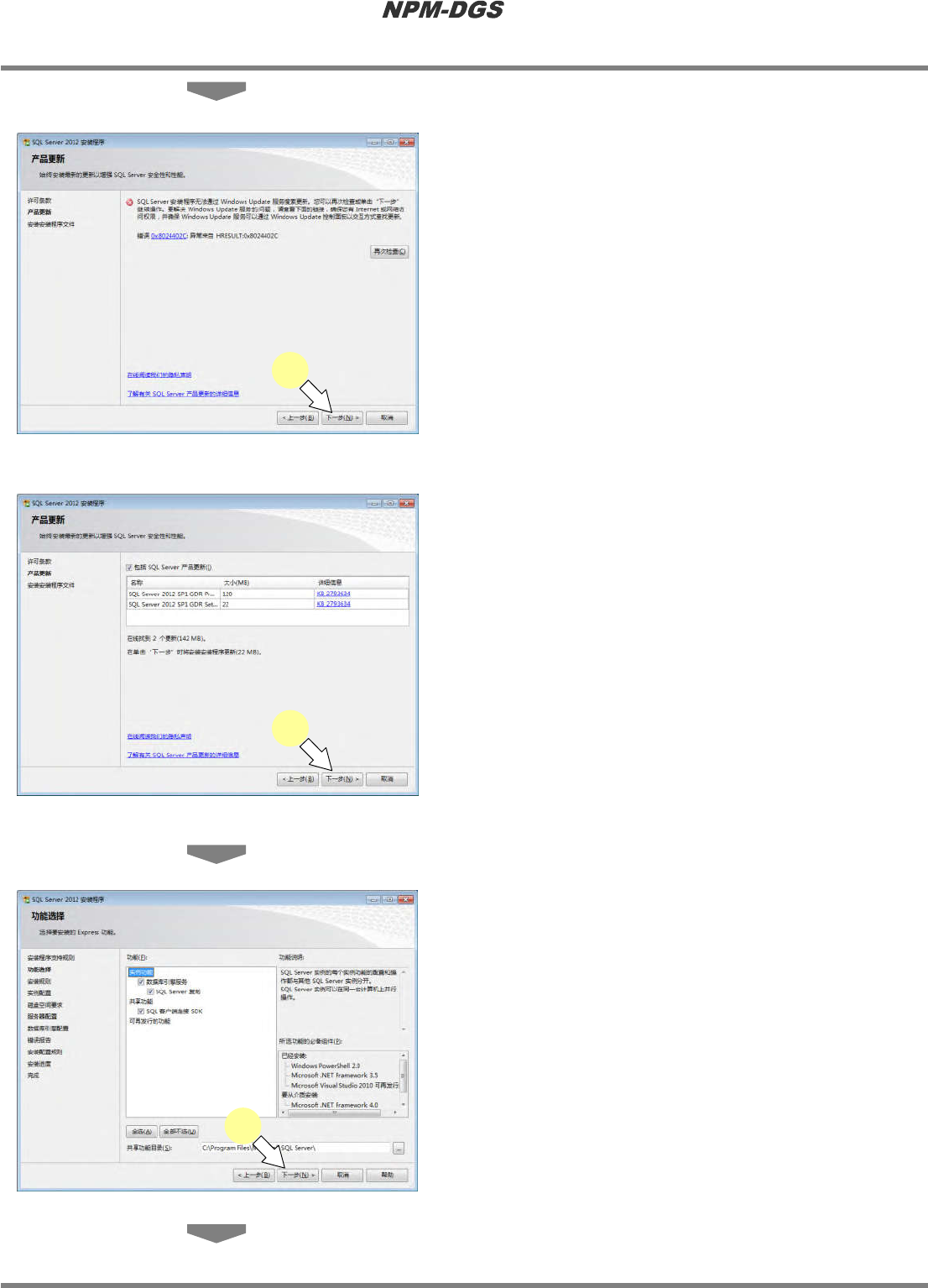 程序手册 2.1 NPM-DGS 的安装 Page 2-14 EJS9AC-MB-02P-12 ( 没有连接网络时 ) 4 点击 [ 下一步 ] 。 · 没有连接网络和连接网 络时的画面有所不同。 ( 连接了网络时 ) 5 点击 [ 下一步 ] 。 Insta ll020101S-99C 00 4 Insta ll020101S-100C00 5 Insta ll020101S-98C 00 4