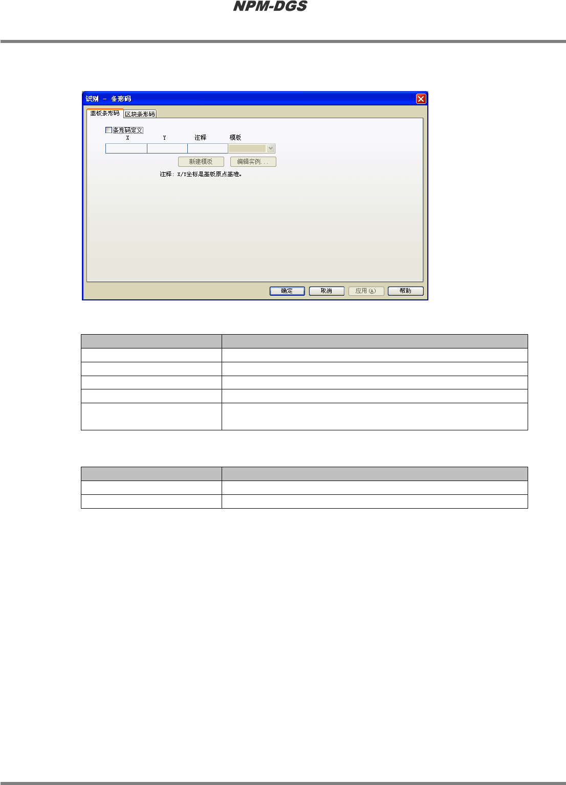 程序手册 5.8 PCB 编辑 Page 5-198 EJS9AC-MB-05P-20 n 基板条形码 n 设定项目 项目 说明 ‘ 条形码定义 ’ 使用基板条形码时打勾。 ‘X’ 设定基板条形码的 X 坐标。 ‘Y’ 设定基板条形码的 Y 坐标。 ‘ 注释 ’ 输入关于基板条形码的说明。 ‘ 模板 ’ 使用于本区块标记的模板标记。可以 选择在 ‘5.7 标记的设定 ’ 中编制 的模板标记。在拉下菜单里显示可参 照的模板标记。 n 按钮…
