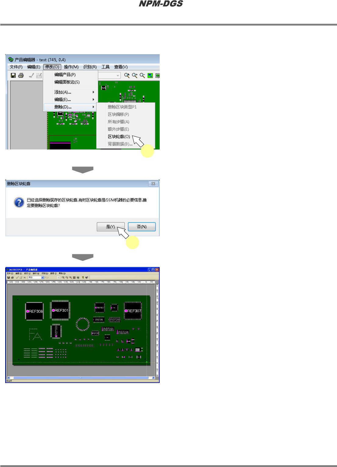 程序手册 5.8 PCB 编辑 Page 5-300 EJS9AC-MB-05P-20 n 区块轮廓的删除 1 选择菜单栏的 [ 修改 ] ® [ 删除 ] ® [ 区块 轮廓 ] 。 · 显示出 < 删除区块轮廓 > 画面。 2 点击 [ 是 ] 。 · 关闭 < 删除区块轮廓 > 画面。 · 删除区块轮廓的图像。 Project050808S-07C00 Project050808S-06C02 2 Proj…