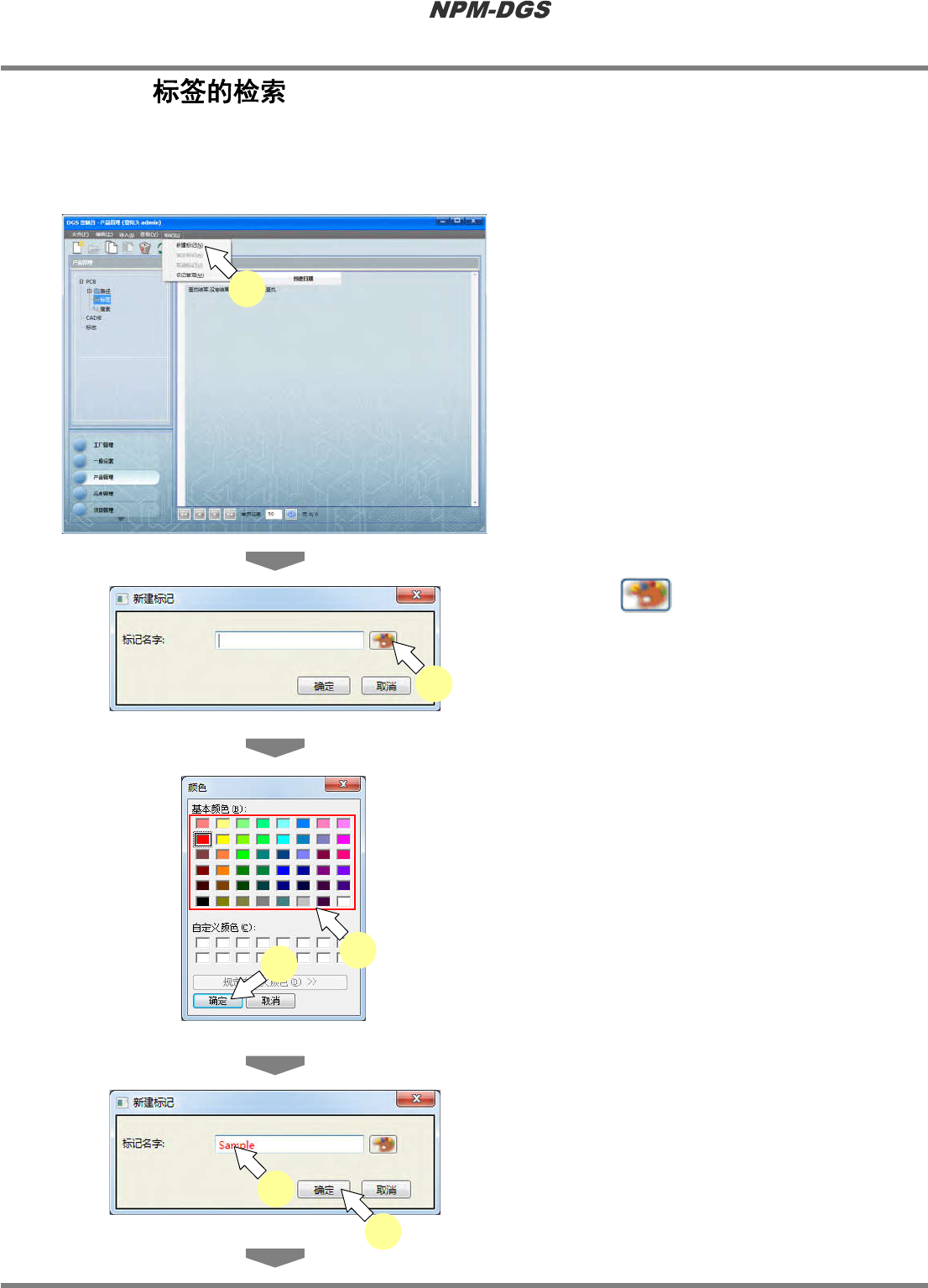 程序手册 5.9 PCB 搜索 EJS9AC-MB-05P-20 Page 5-355 5.9.2 给每个 PCB 配上标签,进行标签检索。 n 标签的新建 1 选择菜单栏的 [ 标记 ] ® [ 新建标记 ] ,或 者在 PCB 一览表上弹出右击菜单,选 择 [ 新建标记 ] 。 · 显示出 < 新建标记 > 画面。 2 点击 。 3 从显示的调色板中选择颜色后,点击 [ 确定 ] 。 4 输入 ‘ 标记名 ’ 。 * 如…