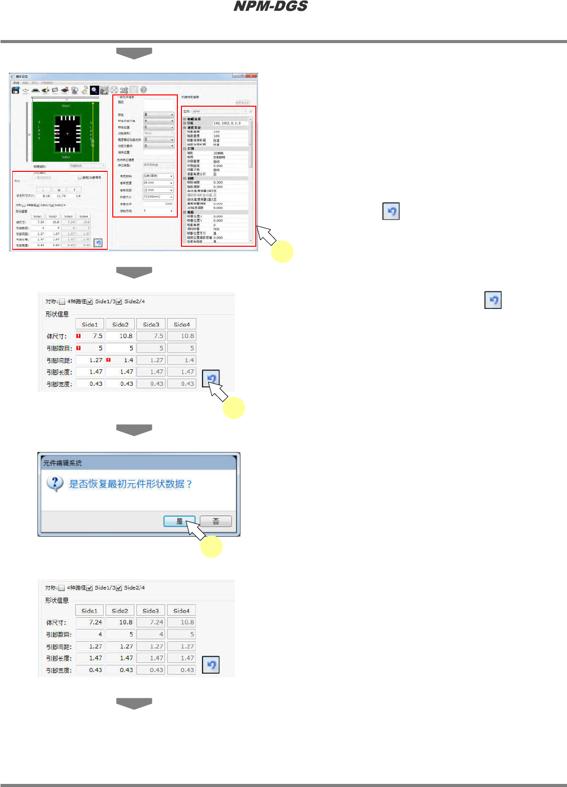 对形状信息进行复位时,点击