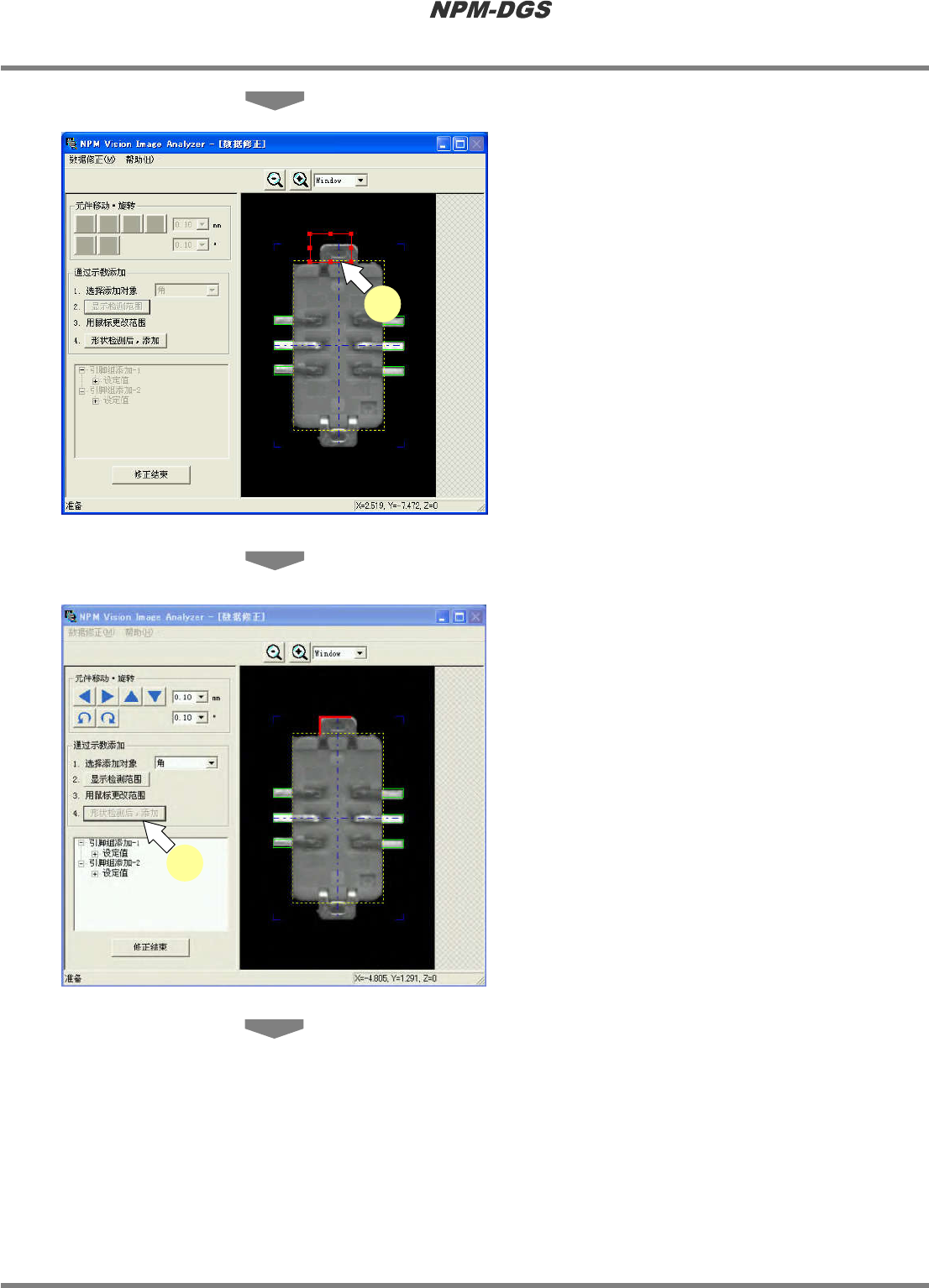 程序手册 6.9 使用设备识别错误图像执行识别测试 Page 6-210 EJS9AC-MB-06P-18 3 或者通过下拉框,或者通过菜单栏的 [ 数据修正 ] ® [ 选择添加对象 ] → [ 添加 对象 ] 来选择添加对象。 ‘ 引脚 Gr.’: 引脚列 (1 ~ 255 根,包含脱落 ) ‘ 球组 Gr.’: 球组排列 (2 × 2 ~ 64 × 64 、包含脱落 ) ‘ 矩形孔 ’: 内侧明亮或黯淡的矩形 ‘ 圆孔 ’: 内侧…
