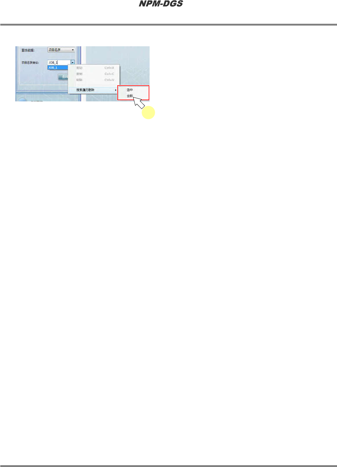 程序手册 7.1 概要 Page 7-30 EJS9AC-MB-07P-20 n 删除搜索履历 1 选择文本框后,通过右击菜单选择 [ 搜 索履历删除 ] ® [ 选中 ] 或 [ 全部 ] 。 [ 选中 ] : 从履历中删除显示在所 选择文本 框上的搜索履历。 [ 全部 ] : 删除显示在履历下拉菜 单上的全 部搜索履历。 * 搜索履历的删除,只可 在选择了 [ 项目名字 ] 或 [PCB 名 ] 。 Product070104S-1…