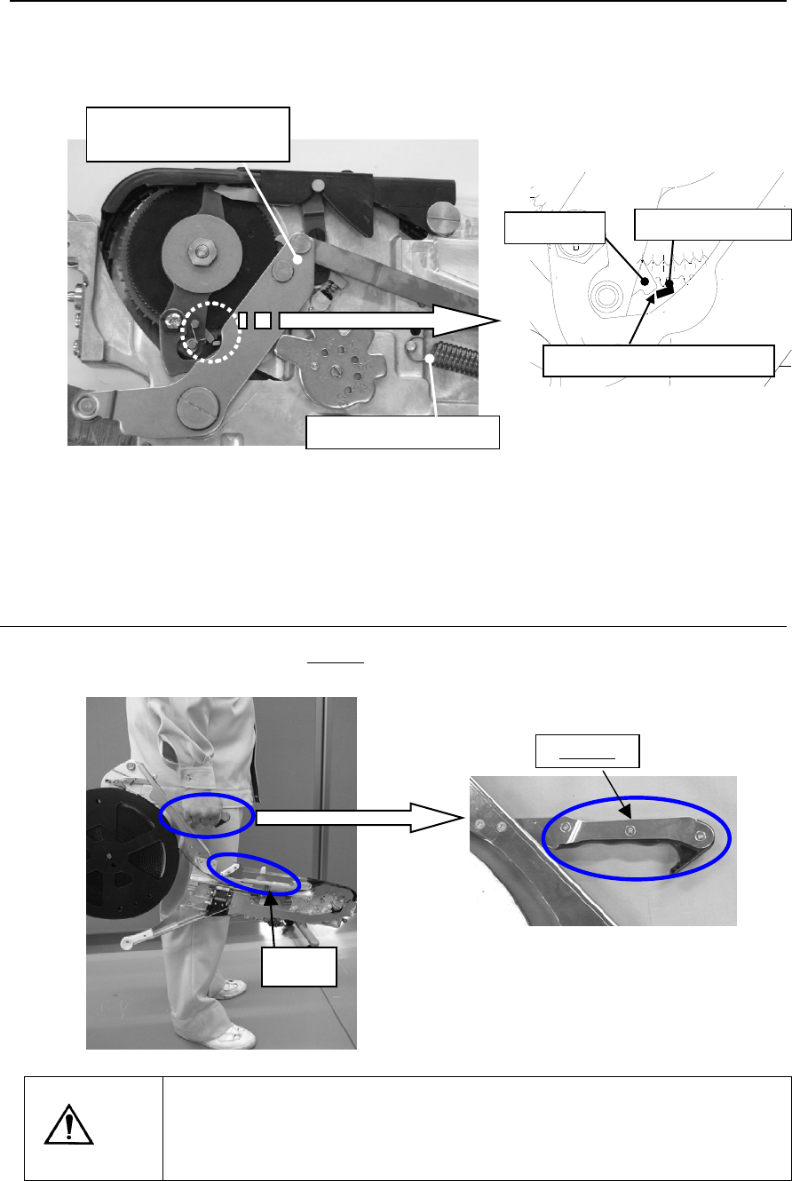 ATF12/16/24 使用说明书 R e v 0 0 a 12 2-2-2. 棘轮爪止动器的调整 1) 请把推顶杆设定为推顶的状态。 ※拆下返回弹簧的话,容易操作。 図 2-2-3 2) 请把棘轮爪和棘轮爪止动器的间隙调整为 0~0.05mm, 然后用棘轮爪止动器螺丝进行固 定。 3) 请在棘轮盘四周的 4 处以上的位置确认传送状态。 2-3. 装置的拿取搬运 请用手紧紧地握着带式供料器的 夹紧部 搬运。 図 2-3-1 注意 · 拿…