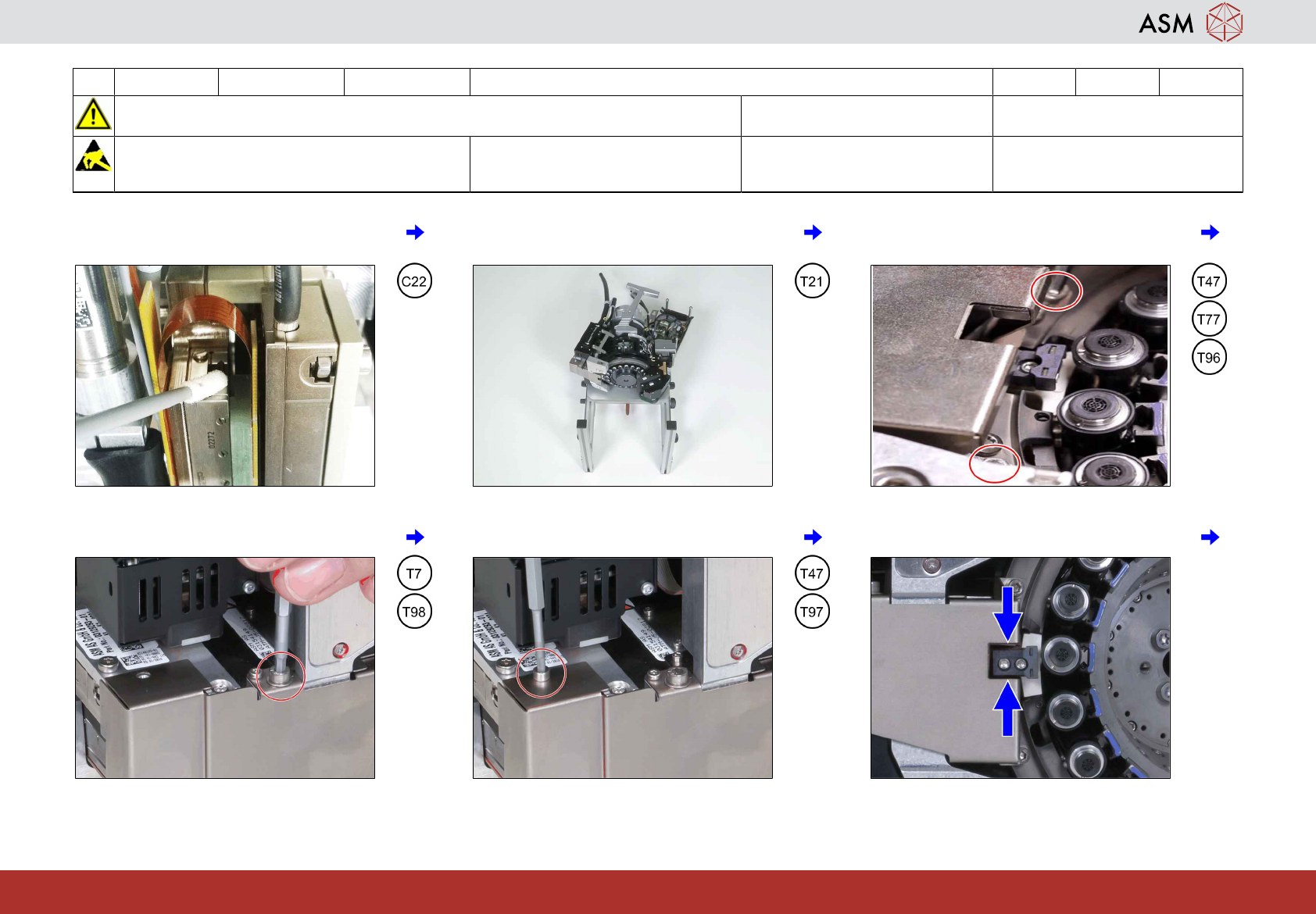 5 3-monthly C&P20 P2/M3 清洁/润滑 Z 轴线性引导装置 6 分钟 y 5 / 5 开始维护前,请参阅用户手册中的安全说明 注意!遵守防静电守则 工具 T7、T21-T23、T47、T77、T96-T98 易损件: 耗材: C10、C22 www.asm-smt.com 25 如果出现异常,请拧松 4 颗螺钉并进行第 20 步。