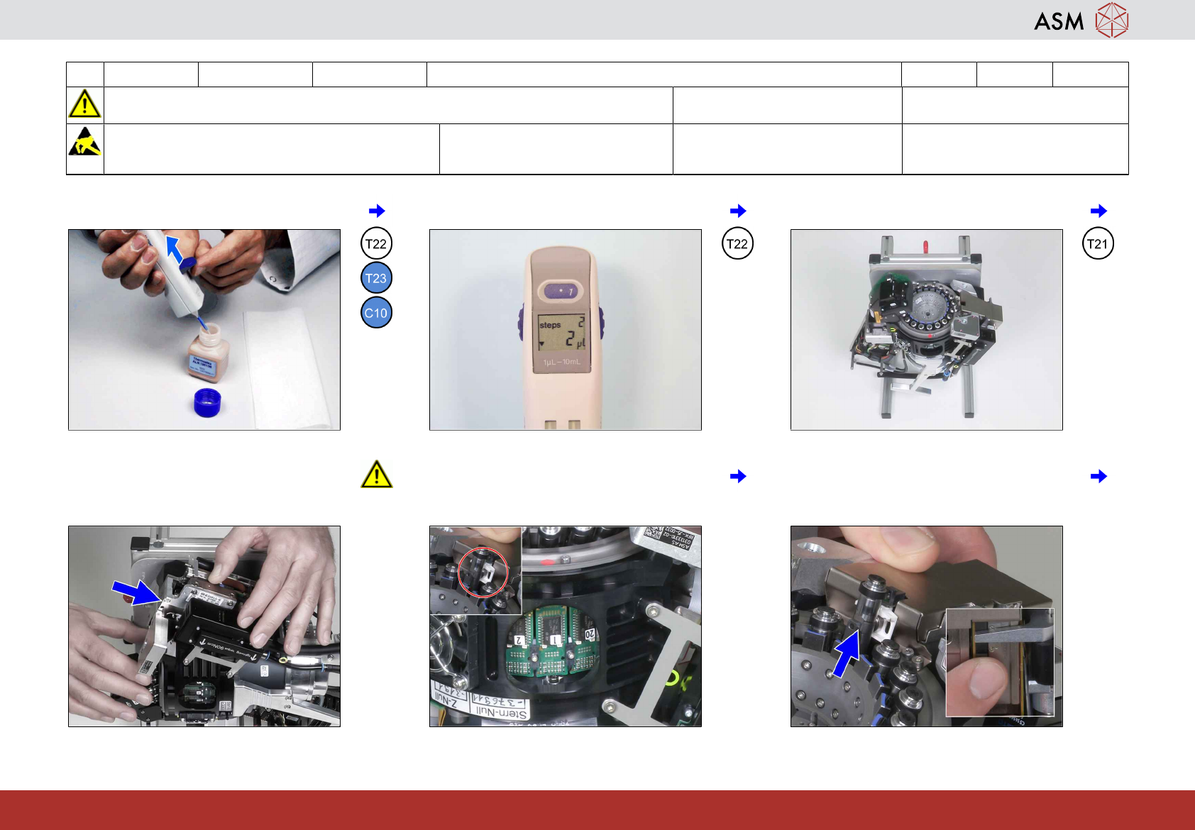 6 3-monthly C&P20 P2/M3 清洁/润滑 DP 线性引导装置 15分钟 2 / 3 开始维护前,请参阅用户手册中的安全说明 注意!遵守防静电守则 工具 T21、T22、T23 易损件: 耗材: C10、C22 www.asm-smt.com 7 清洁两侧的 DP 线性引导装置。 8 将 Z 轴插入贴片头并旋转星型轴直到下一 个段位器与维修标记对齐。 9 为每个段位器重复第 6 到第 8 步。 10 当段位器 1…