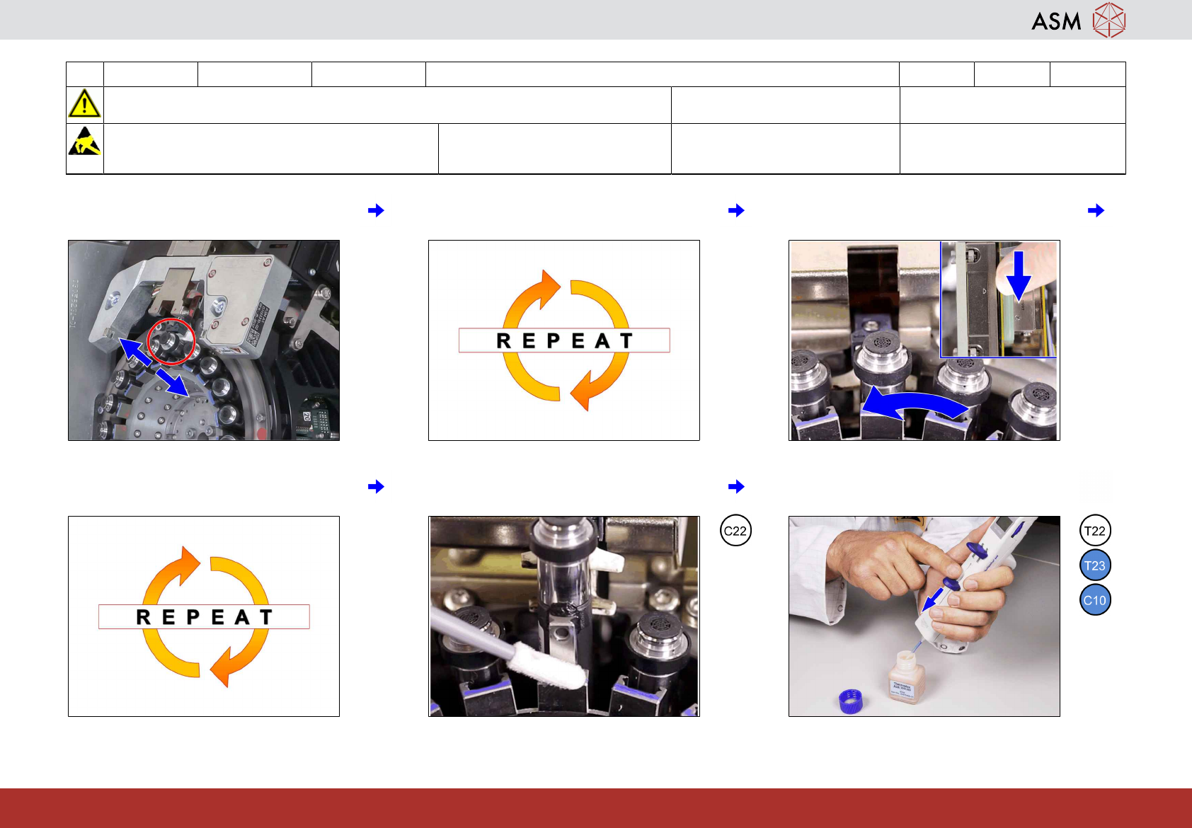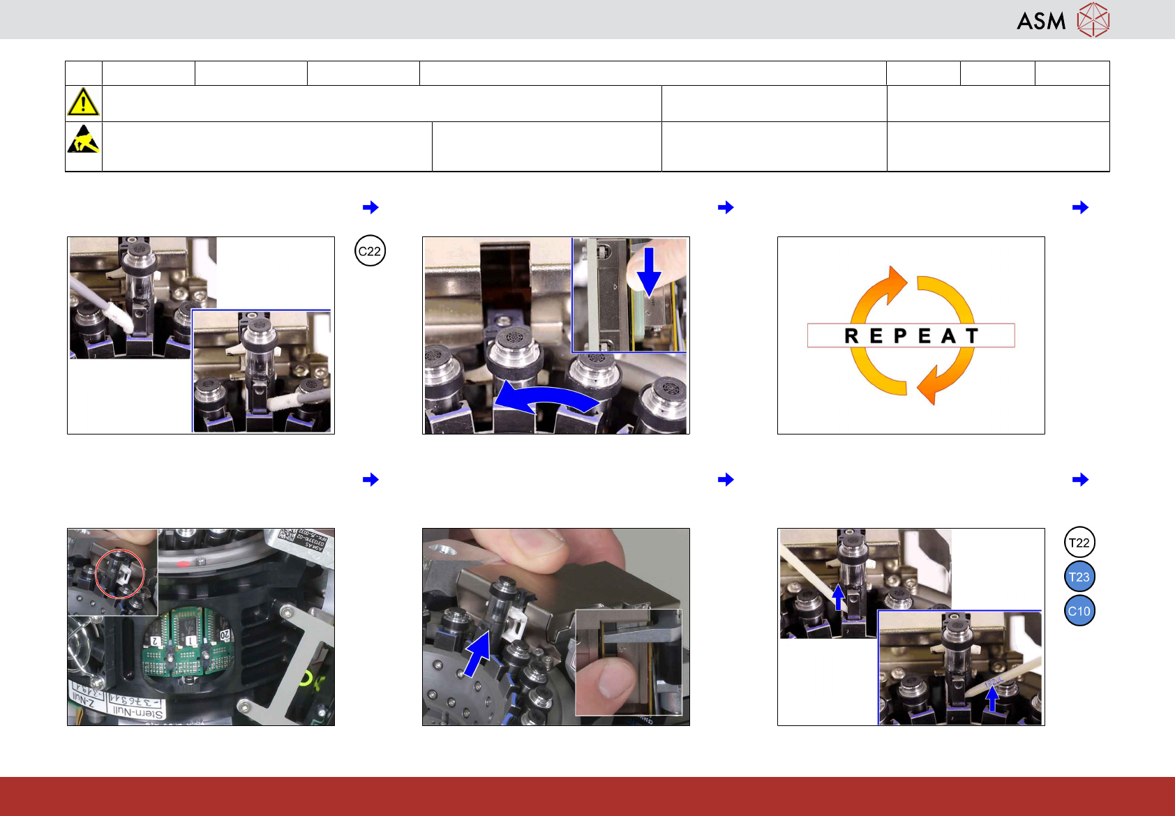 6 3-monthly C&P20 P2/M3 清洁/润滑 DP 线性引导装置 15分钟 3 / 3 开始维护前,请参阅用户手册中的安全说明 注意!遵守防静电守则 工具 T21、T22、T23 易损件: 耗材: C10、C22 www.asm-smt.com 13 将 Z 轴上下移动 5 次。 14 重复步骤 11 至 13 一次。 15 将 Z 轴插入贴片头并旋转星型轴直到下一 个段位器与维修标记对齐。 16 为每个段位器重复…