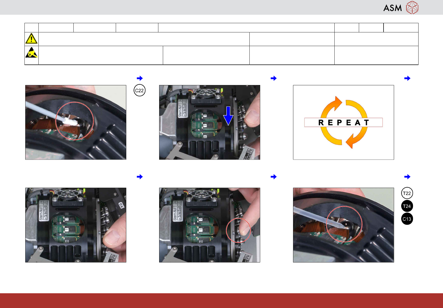 7 3-monthly C&P20 P2/M3 清洁/润滑 DP 驱动轴承 4分钟 1 / 3 开始维护前,请参阅用户手册中的安全说明 注意!遵守防静电守则 工具 T21、T22、T24 易损件: 耗材: C13、C22 www.asm-smt.com 1 准备分液器。参见“准备分液器”附录。 2 转动转轮,调整到 1 µl。 3 将贴片头的右侧向上旋转并将其平放在操 作台上。 4 转动星形轴前,应确保 Z 轴已移入贴片 头,否…