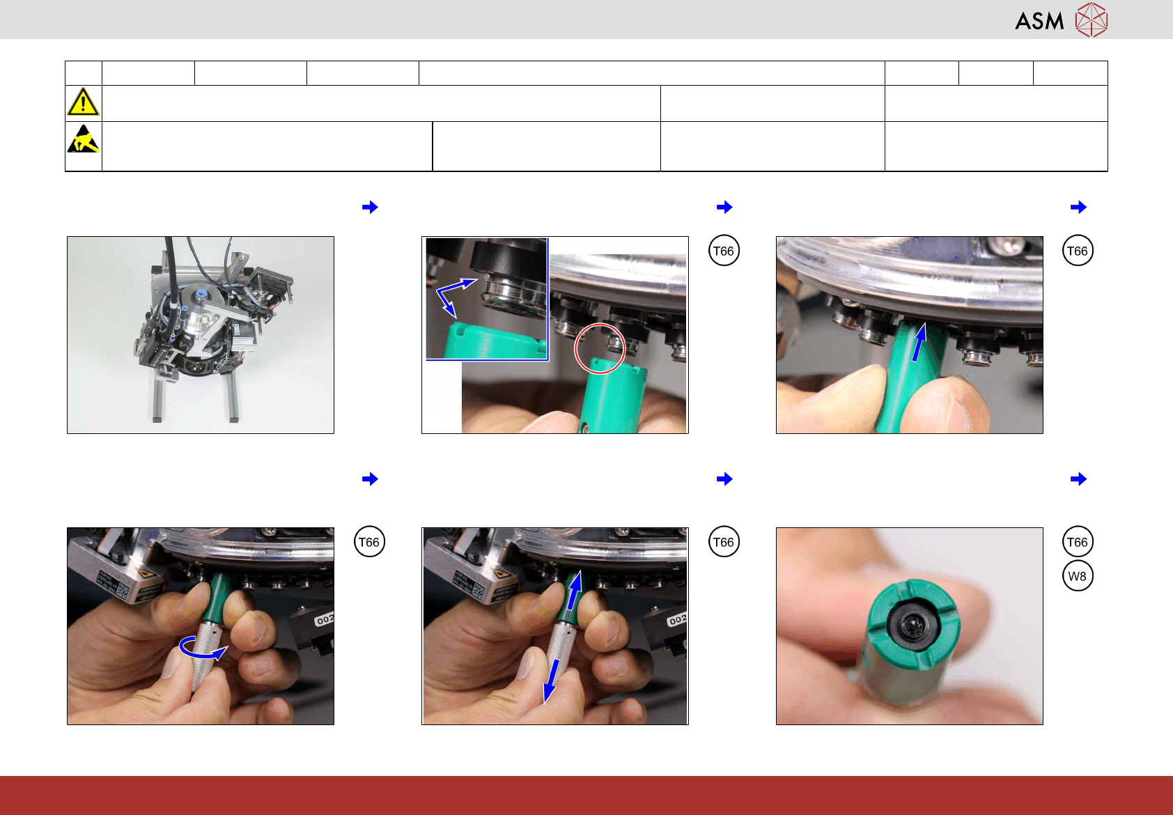 10 3-monthly C&P20 P2/M3 更换过滤盘 5分钟 1 / 2 开始维护前,请参阅用户手册中的安全说明 注意!遵守防静电守则 工具 T21,T66 易损件: W8 耗材: www.asm-smt.com 1 将贴片头放置到直立位置并转动贴片头使 其右侧朝上。 2 将工具置于喷嘴接口上,这样销就会位于 四个槽口中的一个内 3 将导向轴套朝向 DP 的方向按下,直至段位 器弹簧已完全压缩并固定到位。 4 顺时针旋转…