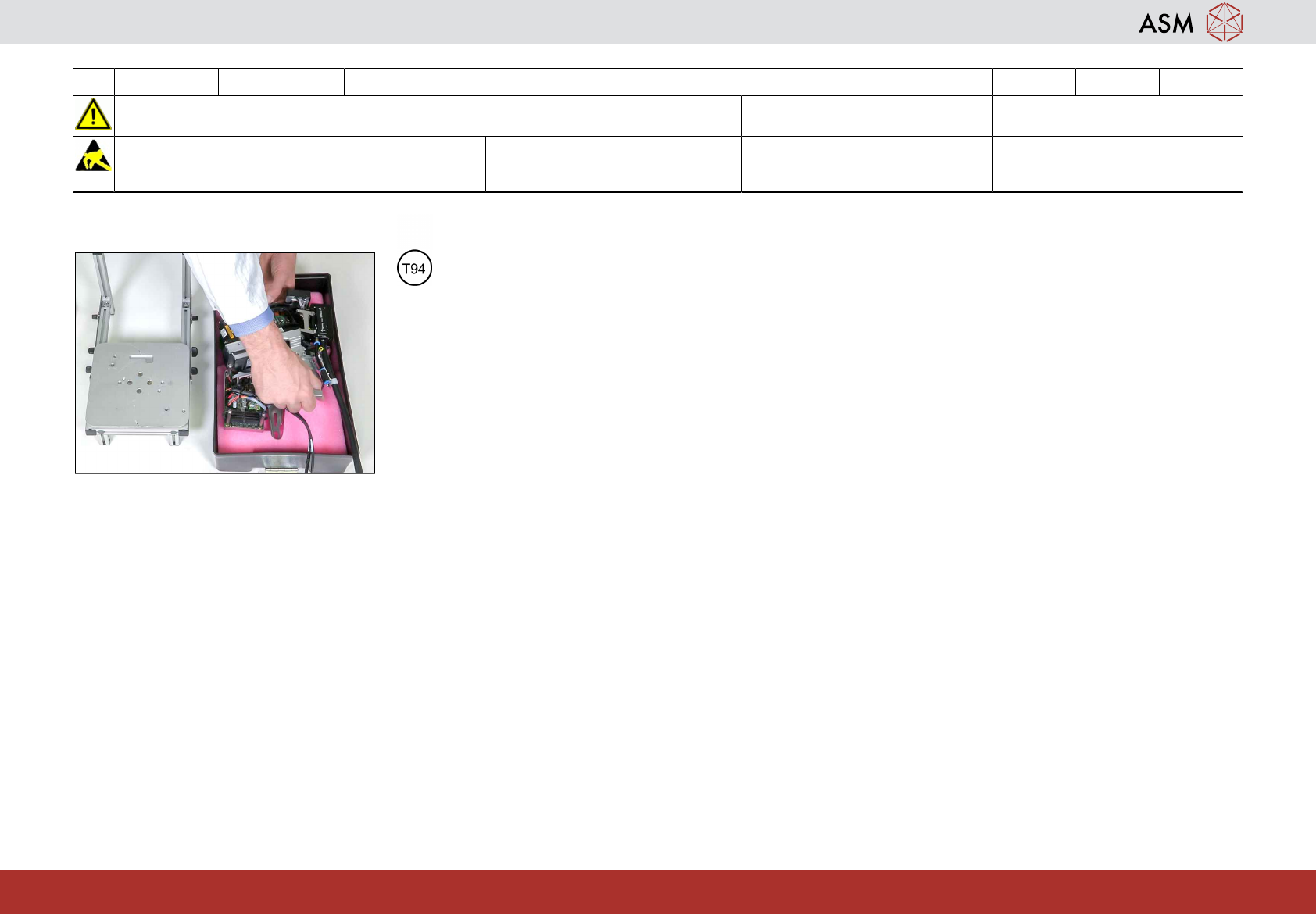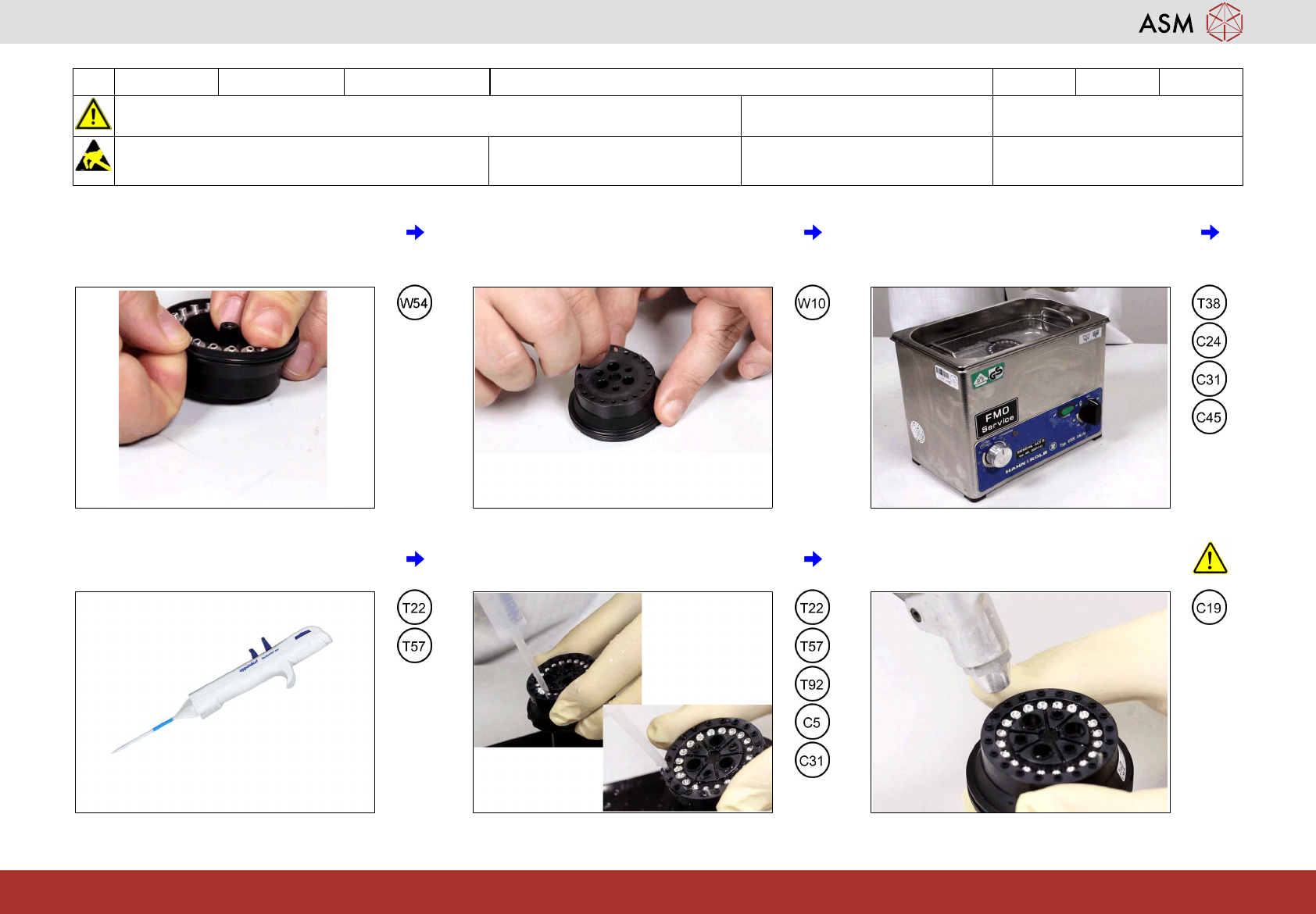 15 3-monthly C&P20 P2/M3 附录:维护保持回路 35分钟 1 / 2 开始维护前,请参阅用户手册中的安全说明 注意!遵守防静电守则 工具: T22、T38、T57、T92 易损件: W10, W54 耗材: C5、C19、C24、C31、C45 www.asm-smt.com 1 拆下保持回路上的 O 型环。 2 拆下保持回路上的密封垫。 3 将保持回路放入超声波浴中。清洗液 = 5% C24 和 95% …
