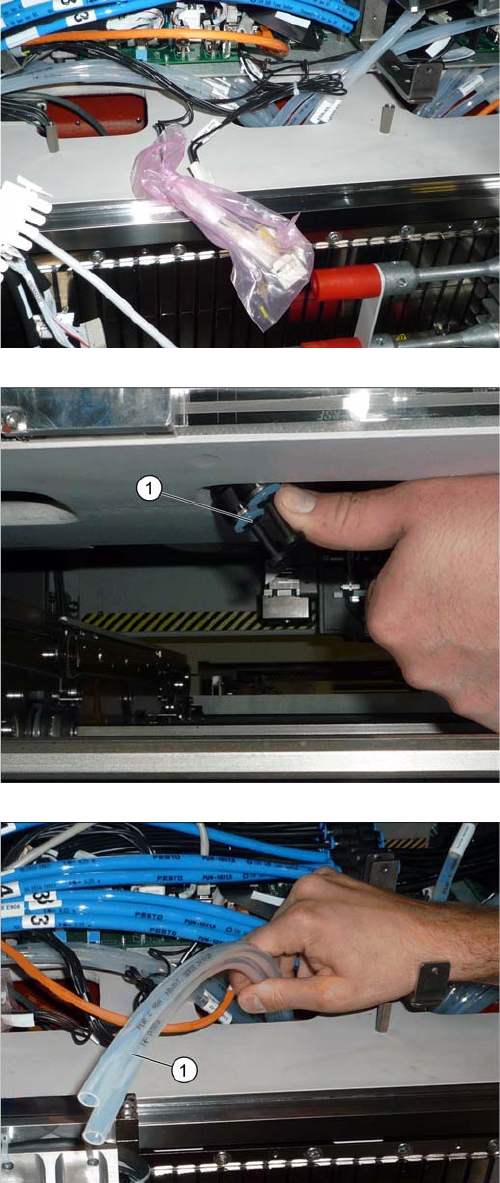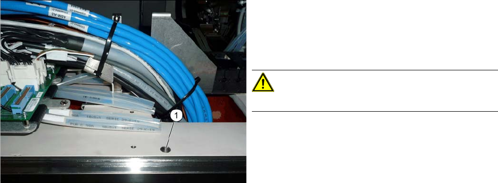 Einbau Kabel und Schläuche vorbereiten 3.1.4 Obere Abdeckung abnehmen 36 Gantry Retrofit Portalna chrüstung ► Kürzen Sie die weißen Schläuche auf beide n Seiten auf Höhe der gro ßen Bohrung (1) . Kürzen Sie möglichst auc…