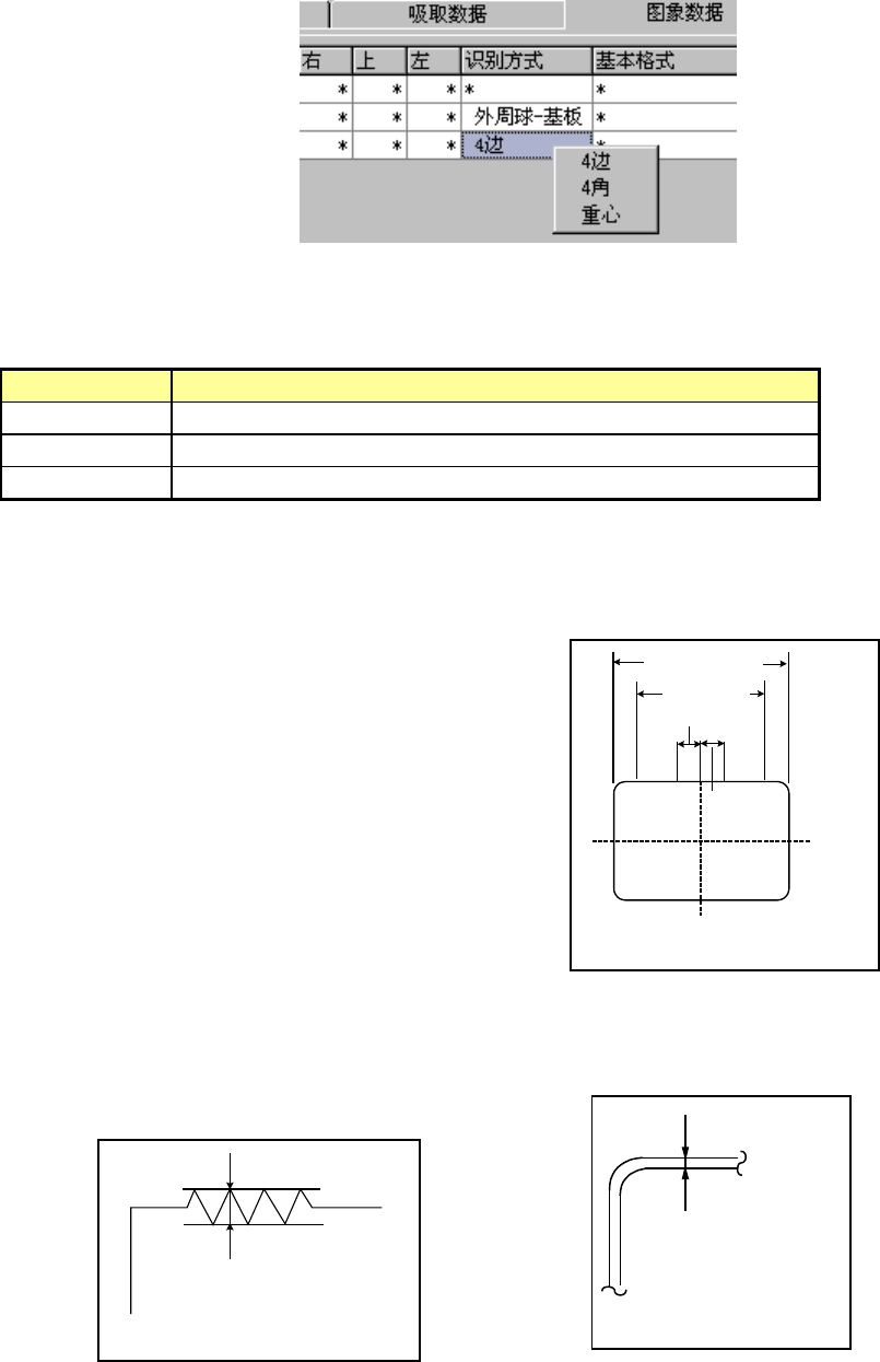 EPU 使用说明书 第 4 章 制作生产程序 4- 11 0 2) 进行元件外形识 别时 图 4-1-7-3-2 在列表画面上设置 识别方式 ( 外形识别元件 ) 表 4-1-7-3- 2 识别方式 选择项目 ( 当 为外形识别 元件时 ) 选择项目 识别方式 4 边 根据四边形的 4 边来识别 的方式。对无角的四 边形有效。 4 角 根据四边形的 4 个角来识别的 方式。 重心 求得当前所拍摄 物体的重心的方 式。 3) 外形识别元件…