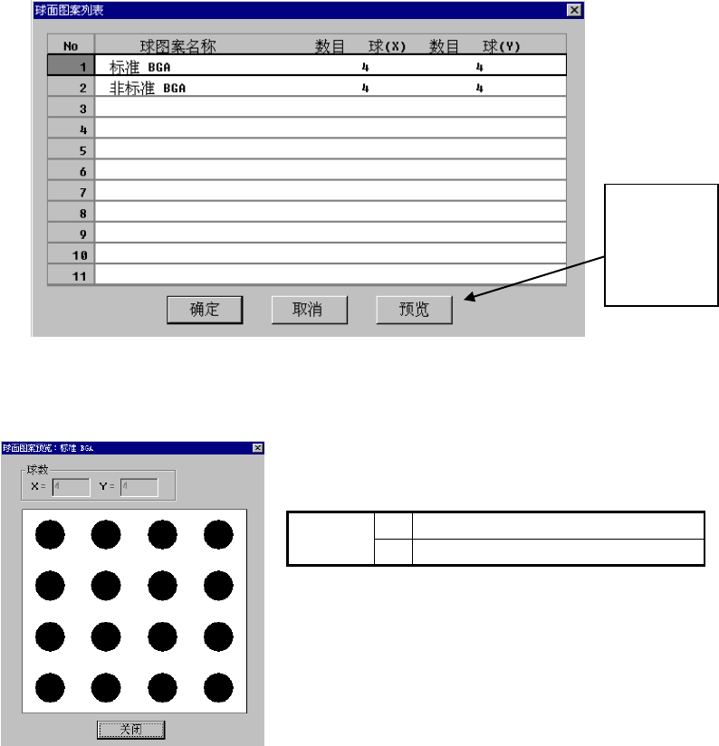 EPU 使用说明书 第 4 章 制作生产程序 4- 11 5 ( 10 )球面图案 ( 仅限 于 BG A 、 FBGA) 设置 BGA 、 FBGA 元件识别 图案。 仅在 “ 识 别方式 ” 为 “ 全球面 ” 或 “ (整个 焊盘 Land )无球 ” 时才能 设置球面图案 。 请右击或按 [ F2 ] 键 ,从显示的列表 中选择。 表 4-1-7-3- 5 球面图案(仅限于 BGA 、 FBGA ) 球面图案选择项 目一览 球面…