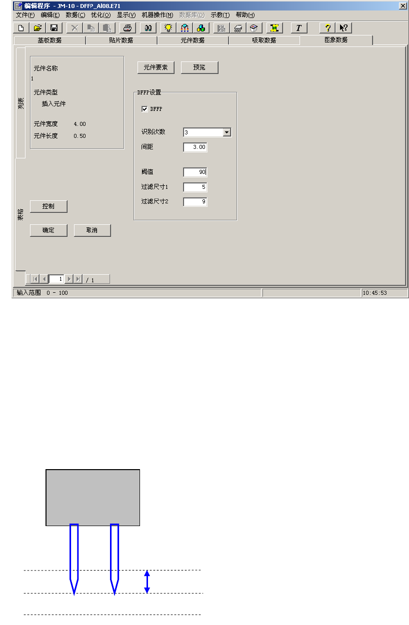 EPU 使用说明书 第 4 章 制作生产程序 4- 122 ( 16 ) DFFP 设置 ( 仅在插入元件时 ) 在插入元件识别 时设置各项参数。 请各参数的值的 计测参照 『 JM- 10 使用说明书』 「 4- 5-4- 3 (6) DFFP VCS 参数自动取得 」 。 ・ DFFP 在识别插入元件 时进行选择。 在 VCS 选择中, 选择 27mm 选项,安 装有 DFFP VCS 单元时, 可以进行选择。 ・ 识别次数 设定 …