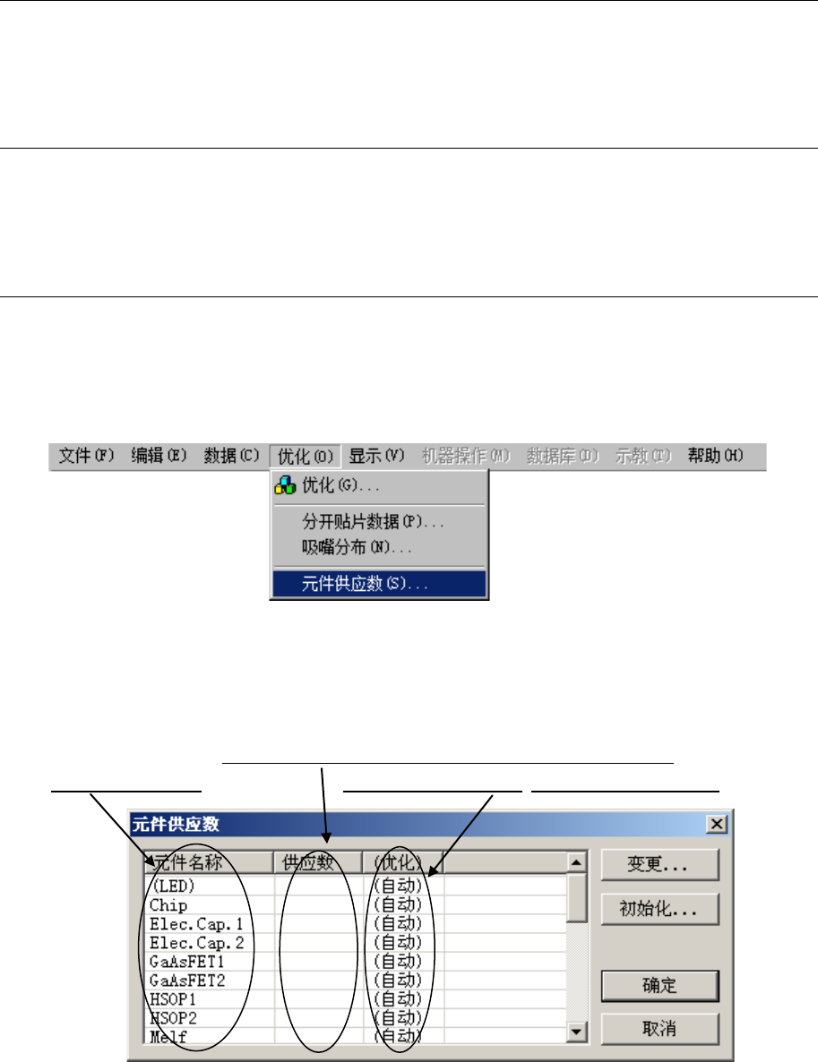 EPU 使用说明书 第 4 章 制作生产程序 4- 129 4-2 优化 优化是指对编辑 程序制作的生产程序 进行: ①送料器配置的 优化。 ② 吸取贴片顺 序的优化 。 4-2-1 设置优化条件 影响优化的原因 有多种。 这些原因中,有 装置本身规定的项目 和用户设置的 项目。 现在,先对用户 设置的项目进行说明 。 4-2-1-1 元件供应数 1 个元件的贴片点数过多时,如果用一个送料器生产,其节拍 ( 速度 ) 会失去平 衡。此时…