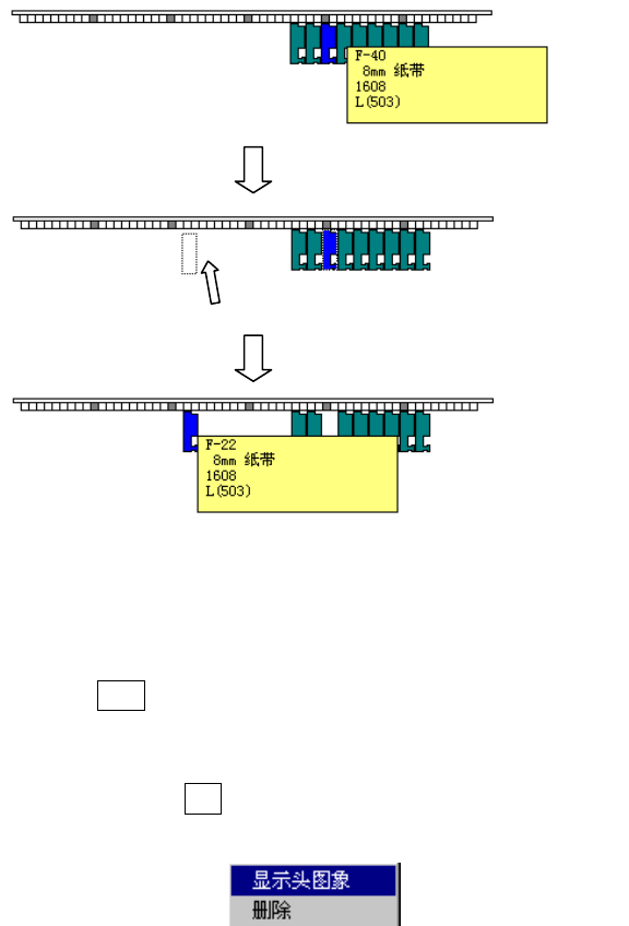 贴片头图像显示模式中,以图像形式显示贴片头的间隔。把送料器对准贴片头间隔进行编排,即可