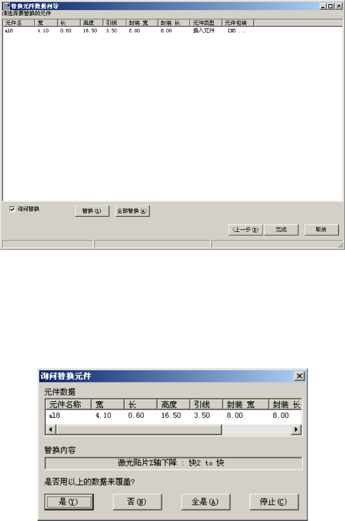 EPU 使用说明书 第 4 章 制作生产程序 4- 155 ③ 元件选择 ( 一览 显示 ) 显示迄今为 止输入的内容。 图 4-3-1-1-11 确认替换内容 ●替换 : 逐一变换已选择 行的数据。 ●全部替换: 进行所有数据的 变换。 ●询问替换: 勾选了 “询问 替换 ” 时, 在执行每 1 项变更替换前, 会显示 确认变更内容 的画 面。 图 4-3-1-1-12 询问变更内容的 对话框
