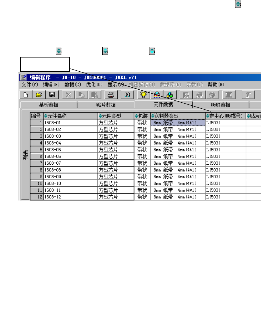 元件名称、包装状态、供应设备、供应(号码)均可作为排序键,使之显示出排序数据。