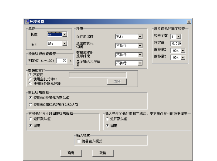 EPU 使用说明书 第 4 章 制作生产程序 4- 164 4-3- 2 环境设置 设置程序编辑环 境。 从菜单栏中选择 「 文件 」 / 「环境设置」 ,则显示设置画面。 图 4-3-2-1 环境设置 (1) 单位 选择编辑时的长 度、压力的显示单位 。 ●长度…从 mm 、 1/100mm 、 inch 中选择。 ●压力…从 kPa 、 级别中选择。 (2) 环境 1 )保存退出 时的状态 ●执行 :在下一 次启动编辑程序时重 新显…