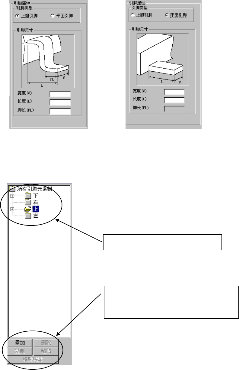 EPU 使用说明书 第 6 章 通用图像元件 6- 23 (3) 引脚属性 选择引脚的类型 ,输入引脚的尺寸。 图 6-4-3-5 引脚特征 ( 鸥翼形引脚 ) 图 6-4-3-6 引脚特征 ( 平板引脚 ) (4) 元件要素组的编 辑 在“引脚元件要 素组一览表”画面中 进行元件要素 组的追加、删除或复 制。其操作方法 与 W indows 的浏览器的操作 方法相同。 ①选择要追加、 删除或复制的文件夹 。 ②选择了追加、 删除、复制…