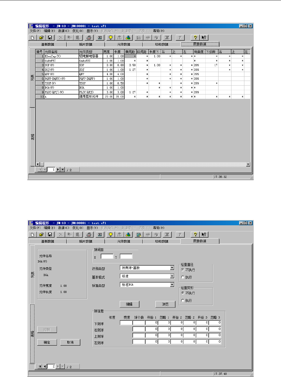 EPU 使用说明书 第 4 章 制作生产程序 4- 105 4-1-7-3 设置项目 QFP 、连接器等的 引脚元件采用俯视图, B GA 等的球 面元件采用 仰视图来制作 。 <QFP ( 俯视图 )> <BGA> ( 1 )“元件名 ”、“元件种类” 、“元件尺寸 ( 横、纵 ) ” 显示「元件数据 」 中已 输入的值。 变更时,请用 「元件数据」 执行。 ( 2 )间距 (X 、 Y) 输入引脚间或球 面间…