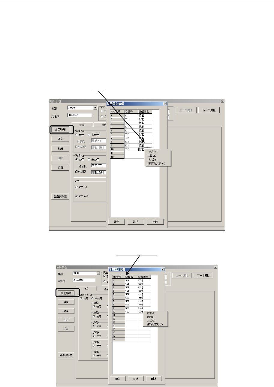 EPU 使用说明书 第 3 章 EPU 设置 3- 19 3-7-3 按钮说明 ( 1 )前一属性 退避正在编辑的站台属性的变更内容,显示前一站台属性的画面。 正在编辑的站台在最前面时,该按钮无效。 ( 2 ) 后一属性 退避正在编辑的站台属性的变更内容,显示下一站台属性的画面。 ( 3 ) 固定吸嘴 请在 ATC 上设置吸嘴编号和种类。在此设置的吸嘴,可在编辑程序的优化中浏览。 在种类项目中,单击 < 右 > 键,…