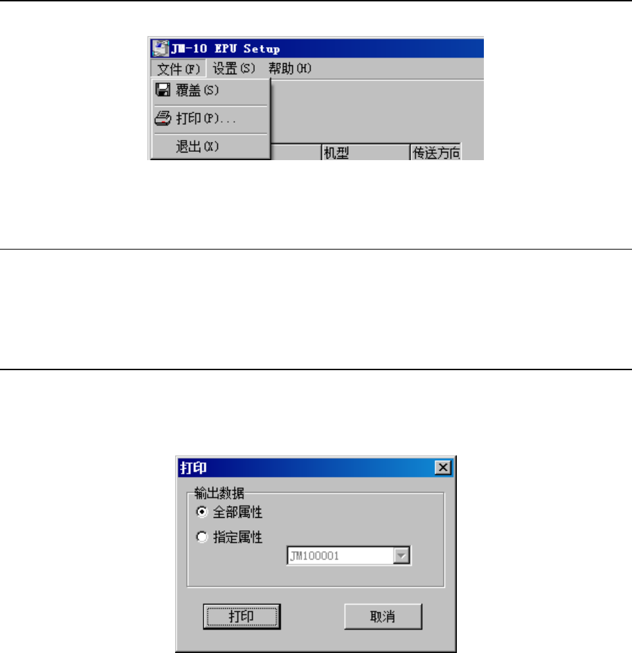 EPU 使用说明书 第 3 章 EPU 设置 3- 21 3-8 文件 图 3- 8-1 文件菜单 3-8-1 覆盖 对 EPU 设置中所设置的内容进行保存。 从文件菜单中选择「覆盖」,当前的设置内容即被保存。 3-8-2 打印 把 EPU 设置的内容输出到打印机。 从文件菜单中选择「打印」。 选择打印后,会显示如下的对话框。 图 3- 8- 2 打印画面 「全部属性」 : 输出当前正在设置的所有站台信息。 「指定属性」 : 打印下拉式…
