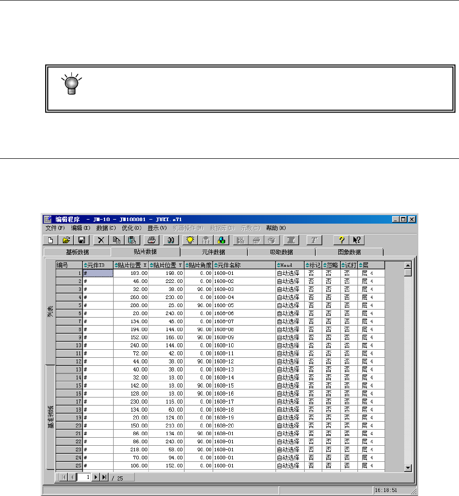 EPU 使用说明书 第 4 章 制作生产程序 4- 30 4-1- 4 贴片数据 输入与贴片元件 的贴片坐标有关的信 息。 多电路板时,输 入相对于“基准电路 ”的信息。 贴片点数 最多为 3 , 000 点,分割基板时 最多可输入 10 , 000 点。 4-1-4- 1 贴片数据画面的显示 制作基板数据后 , 单击画面上方 的 「贴片 数据」 选项卡, 显示贴片数据 制作画面 ( 下图为制 作完成例 ) 。 图 4-1-4-1-1 …