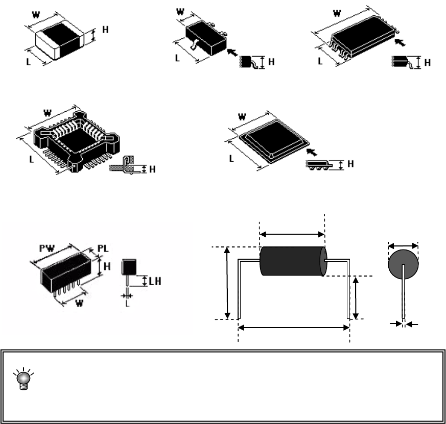 例>W = 外形尺寸 横 L = 外形尺寸 纵 H = 元件高度 LH = 引脚长度