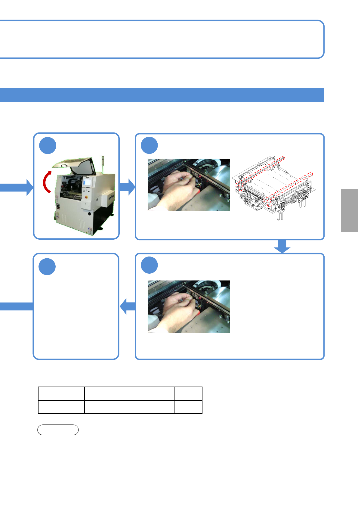 SPG EJP6AC-MB-0 4MM-01 4-1-6 -1 基板传送皮带的更换 1 基本定位升降机的基板传送皮带的更换 使用工具 : 无需 所要时间 :10 分钟 3 2 1 ( 退避网板清洁单元后,将 Y 工作台移动到前方 ) 9 10 切换到工程师模式 ( → “操作篇”的 P.2- 1-3) 11 12 确认基板搬送 ( → “操作篇”的 P.5- 1-3) ON 取下锁头 13 更换 维修保养篇 4-1-6 8