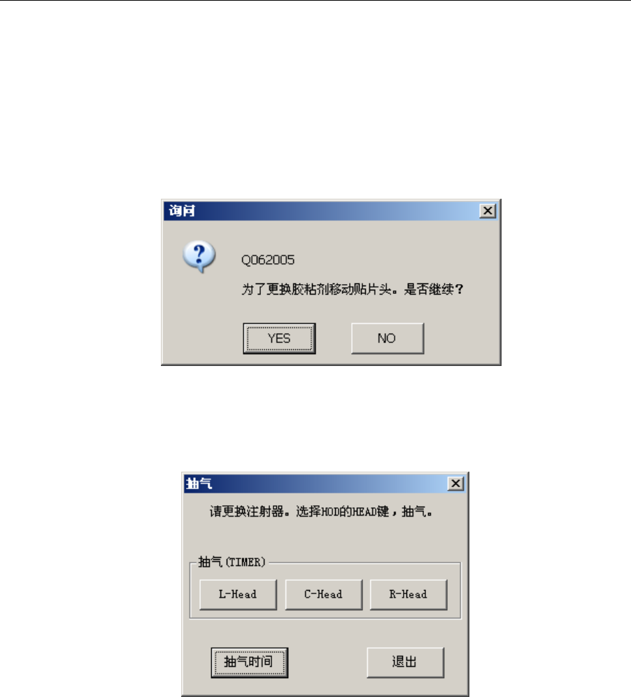 按下「YES」按钮时,点胶头被移动到更换注射器位置。之后显示抽气画面,催促用户更换。