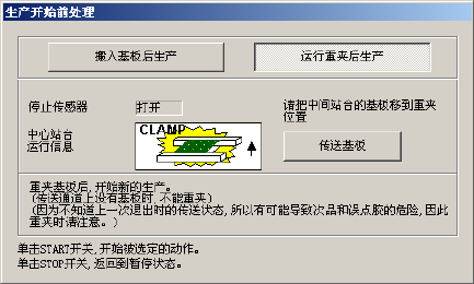 显示生产开始前处理画面是搬入基板后生产,还是重夹后生产。