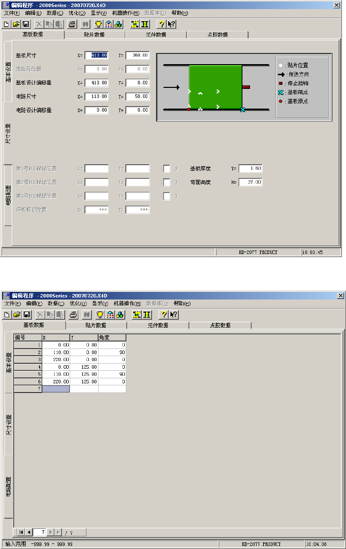 第 1 部 基本 篇 第 4 章 制作 生 产程序 4-25 2) 非矩阵电路板 各电路角度和各 电路间的 距离 ( 间距 ) 不固 定的基板 ( 请参照下页 例子 ) 。 以基板原 点为基准, 分别指定 X 、 Y 角度, 配置各电路 。 因此, 即使电路 间的间距和角 度不同也 能个别处理。当 然,通过 固定电路间距和 角度,也 能制作矩阵电路 基板数据 。 图 4-3 -3-2-3 -2 基板数据 尺寸设置画面 ( 非矩阵 电路板…