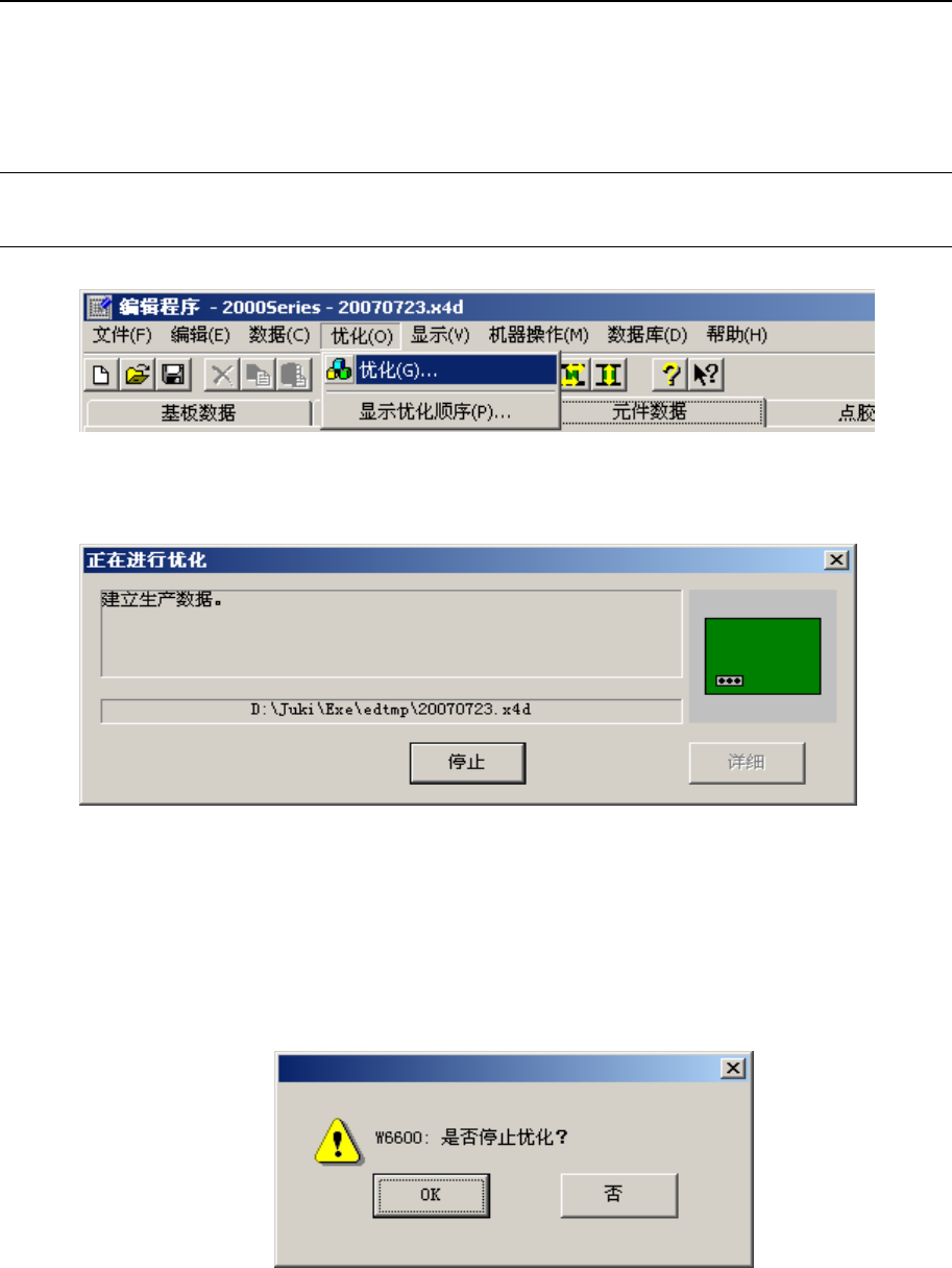 第 1 部 基本篇 第 4 章 制作生产程序 4 - 45 4-4 优化 为了稳定点胶质 量、缩短 生产工效,可以 调换点胶 顺序。 但因为也需要考虑点胶条件等因素,在调换 遵循一定的规则,因此即 使进行了优化处理, 也不一定能够提 高生产速 度。 4-4-1 执行优化 4-4-1-1 执行优化 1) 在优化条件 设置画面 中,按下「优化 」按钮, 开始执行优 化处理。 图 4-4-1-1-1 选择优化 菜单 2 ) 显示正在进行 优化…