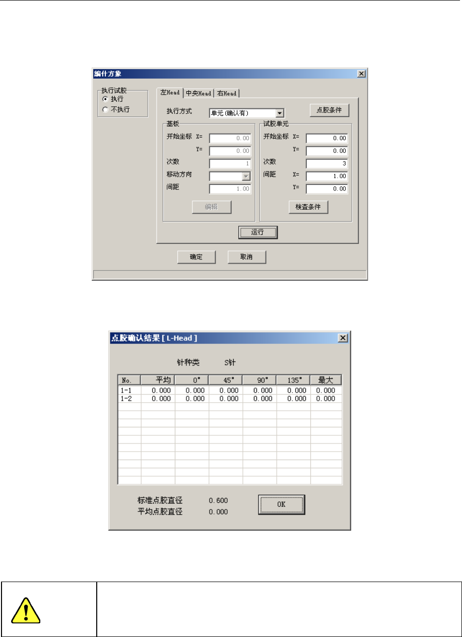 第 1 部 基本篇 第 4 章 制作生产程序 4 - 101 4-5-5 点胶确认 根据生产程序数据确认试胶、点胶。之后,在点胶结果对话框中显示合格与 否的判定。仅在执行 方式为“单元( 有确认) ”、“单元→基 板”时可 以执行。 各项目的详细内 容请参考 “ 4-3-3 基板 数据”。 图 4-5 -5-1 试 胶 数据 之后,在点胶结 果对话框 中显示合格与否 的判定。 图 4-5 -5-2 点胶确认结果 试胶单元上的点 胶直径仅…
