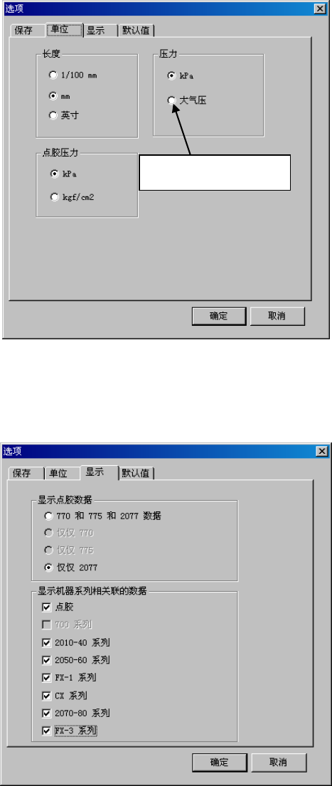 第 1 部 基本篇 第 5 章 数据库 5 - 33 2) 单位 指定长度和压力 的单位。 3) 显示 指定点胶数据、 设备相关 数据的显示。 “大气压” = “mmHg ”。