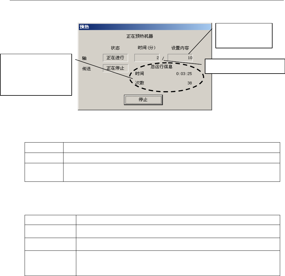 第 1 部 基本篇 第 2 章 生产 2 - 17 2-4-3 运行内容 预热运行期间, 显示下列 画面。 图 2-4-3-1 动 作中画面 电电电象后, 开始电行下列 电电电作 。 表 2-4-3 -1 预热 运行内容 运行对象 运 行 内 容 轴 XYZ θ轴马达和喷吹操作。 但喷吹动作,在反复开 、关 10 次后,自动结束。 传送 传送马达、 支撑台、止动销、 外形基准气缸 (选 项) 开 始动作。 但 止动销、 外形 基准气缸的…