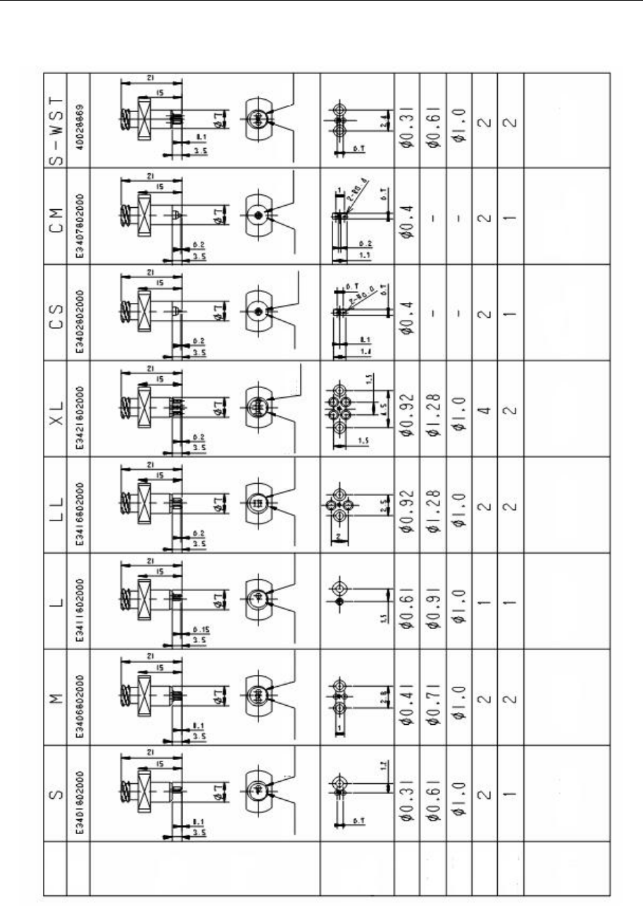 第 1 部 基本篇 第 1 章 设备概要 1 - 8 1-2-1-3 针 请根据点胶图形 和实装元 件的形状,从 S 、 M 、 L 、 LL 、 XL 、 CS 、 CM 、 S- WST 中选择合 适的针。 表 1-2-1-3-1 针一 览表 针名称 货号 形状 ・ 尺寸 前端详 细图 针数 停止挡销数 备注 2 点点胶 2 点点胶 1 点点 胶 2 点点胶 4 点点胶 2 点点胶 2 点点 胶 2 点点胶 ( 中心停止挡销 ) (…