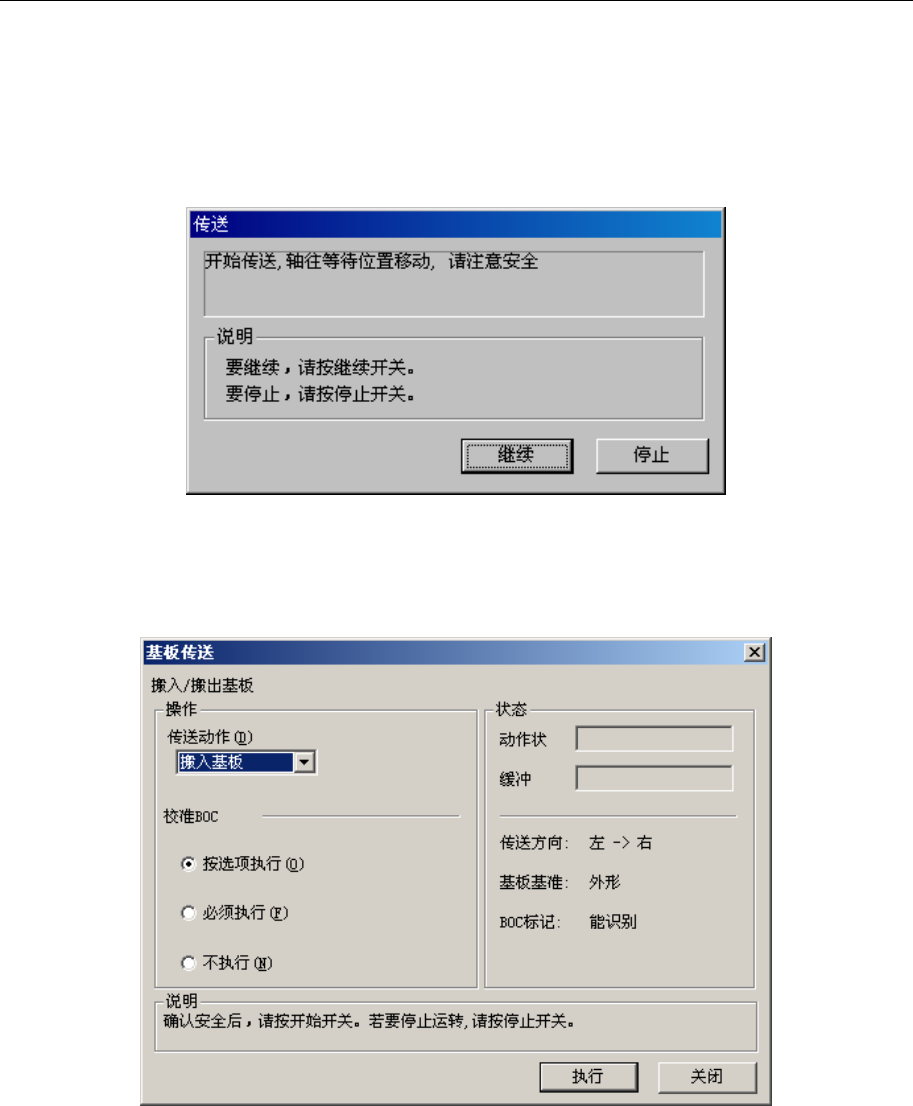 第 1 部 基本篇 第 4 章 制作生产程序 4-80 4-5-4-1 传送 4-5-4-1-1 基板搬入 / 基板搬出 执行基板的搬入 、搬出。 打开安全盖,选 择菜单后 ,为了将轴待避 到安全位 置,显示如下信 息。 确认安全后,请 按下 「继续」 。 图 4-5-4-1-1-1 确认安全 将轴待避到安全 位置后, 显示下列基板传 送画面。 图 4-5-4-1-1-2 基板传送 ·按 < 开始 > 开关 或「执行 」进行…
