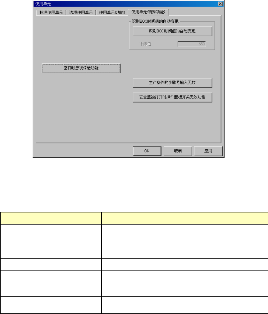 第 2 部 功能详解编 第 7 章 机器设置 7 - 14 7-4-4-4 特殊功能 根据使用环境, 可以使用 有效的特殊功能 。 不适宜使用 时应设 置为 不使用。默 认状 态为 不使用特殊功能。 图 7- 4-4-4 设 置特殊功能 对话 框 1 )特殊功能 概要 特殊功能设置为 有效时 ,其 动 作内容如下表 所示。 表 7- 4-4-4 特殊功能有效 时的动作内 容 No. 项目 功能内容 1 识别 BOC 时阈 值 的自动变 …