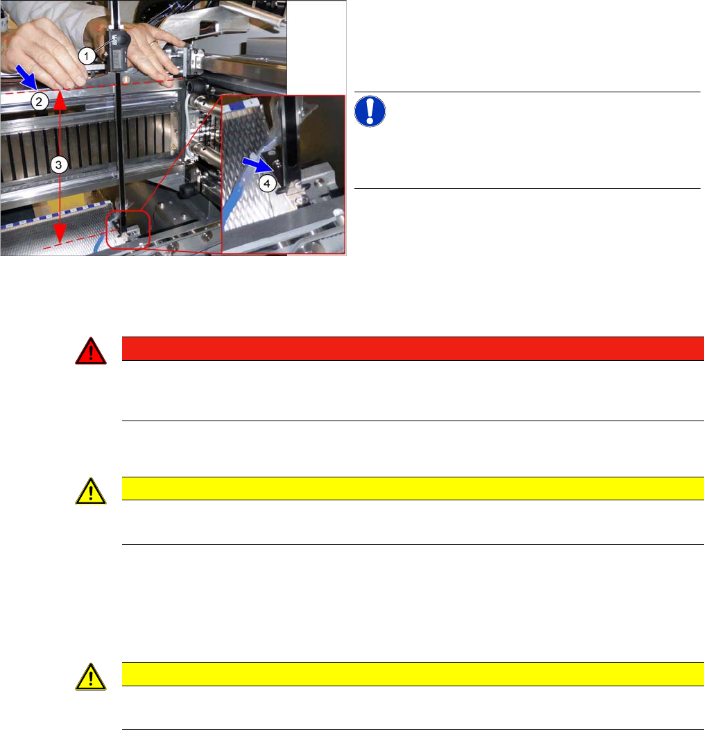 ► Position the measuring scale (1) on the top edge of the X axis upper linear guide (2) and measure