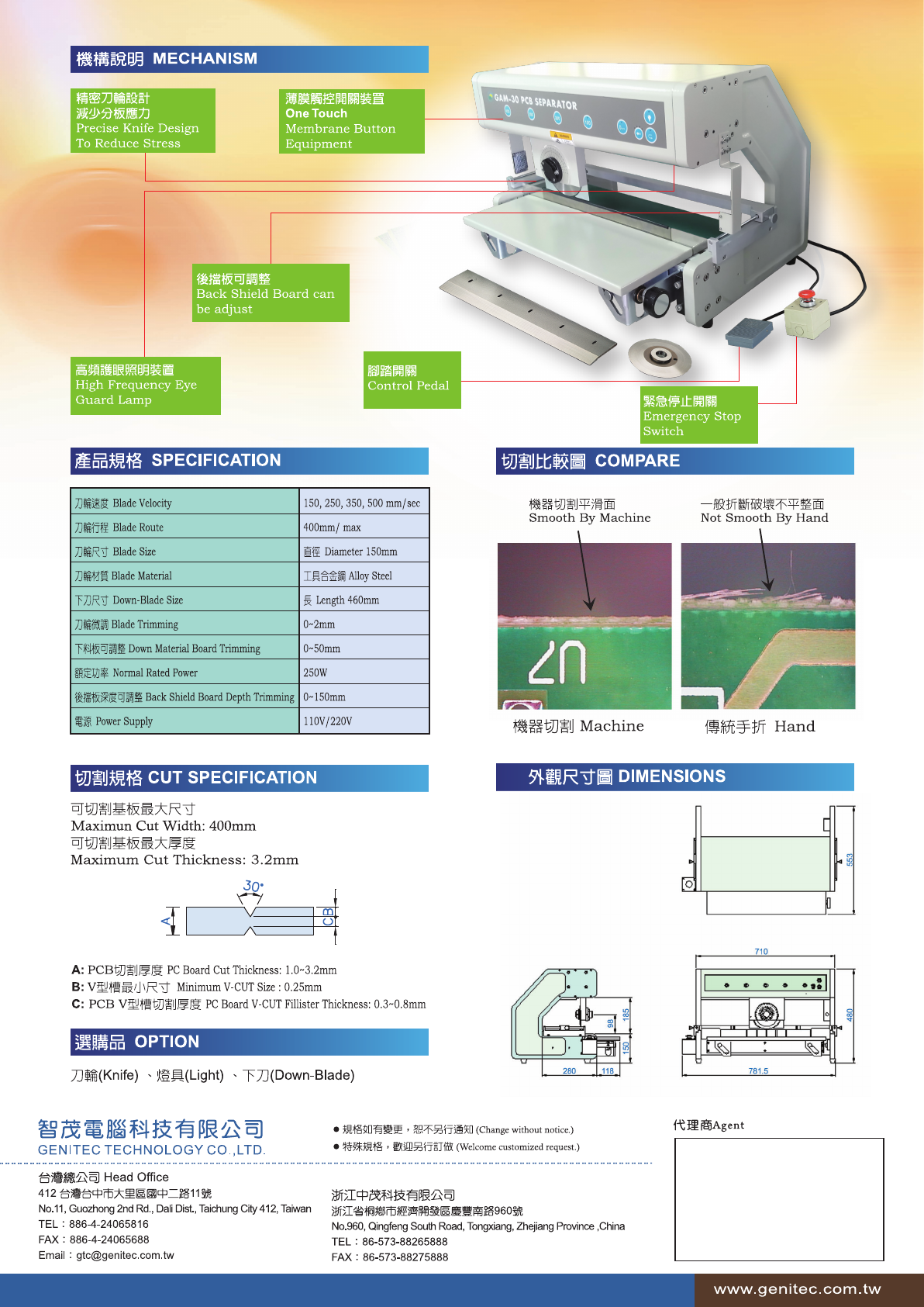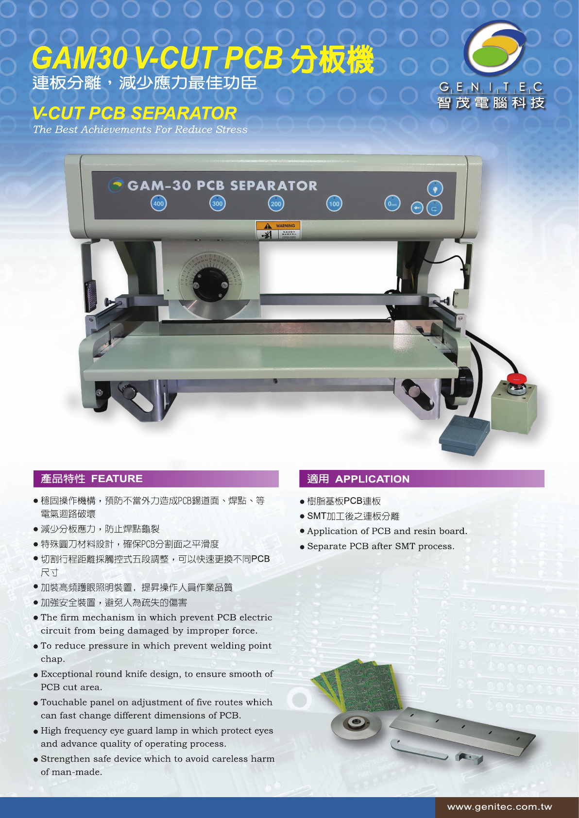 GAM 30 VTCUTrPCB 分板機 連板分離 , 減少應力最佳功臣 G , E , N I T , E , C 智 茂 電 腦 科 技 V - CUTPCB SEPARATOR The Best Achievements For Reduce Stress i GAM - 30 PCB SEPARATOR 產品特性 FEATURE 適用 APPLICATION • 穩固操作機構 , 預防不當外力造成 PCB 錫道面 、 焊點 、 …