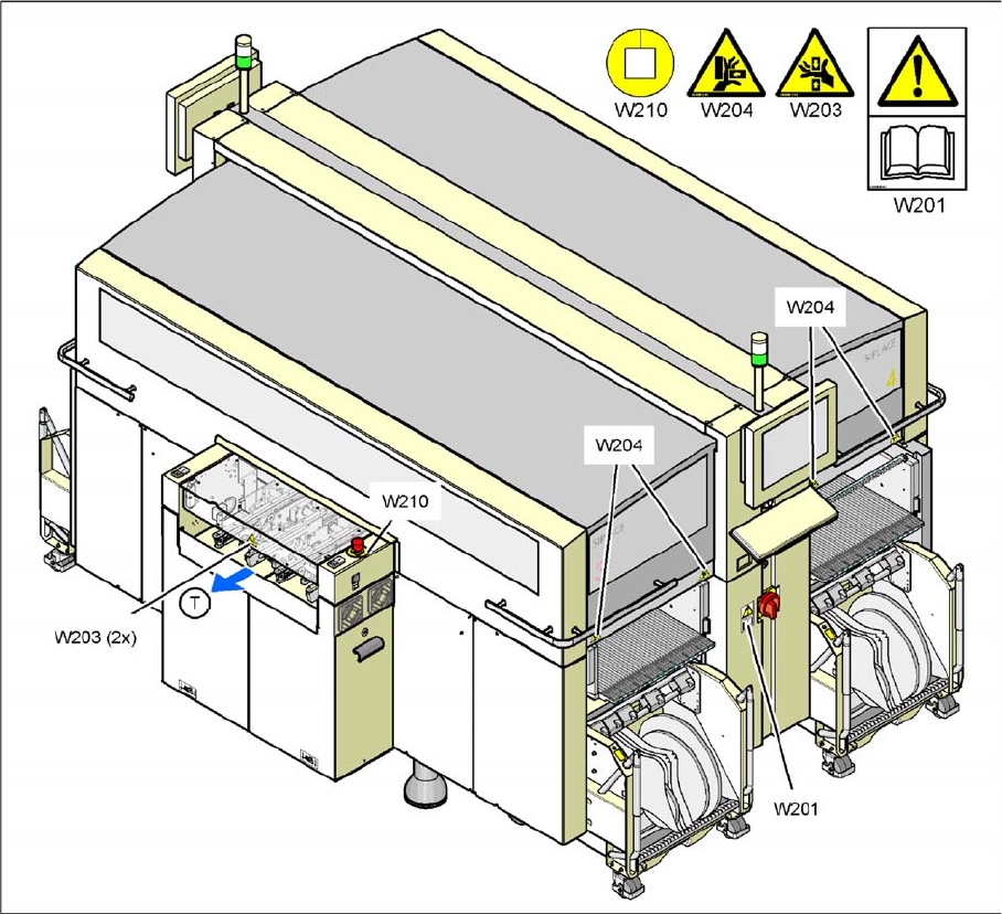 Warning labels W201, W203, W204 and W210 on the placement system - part 1