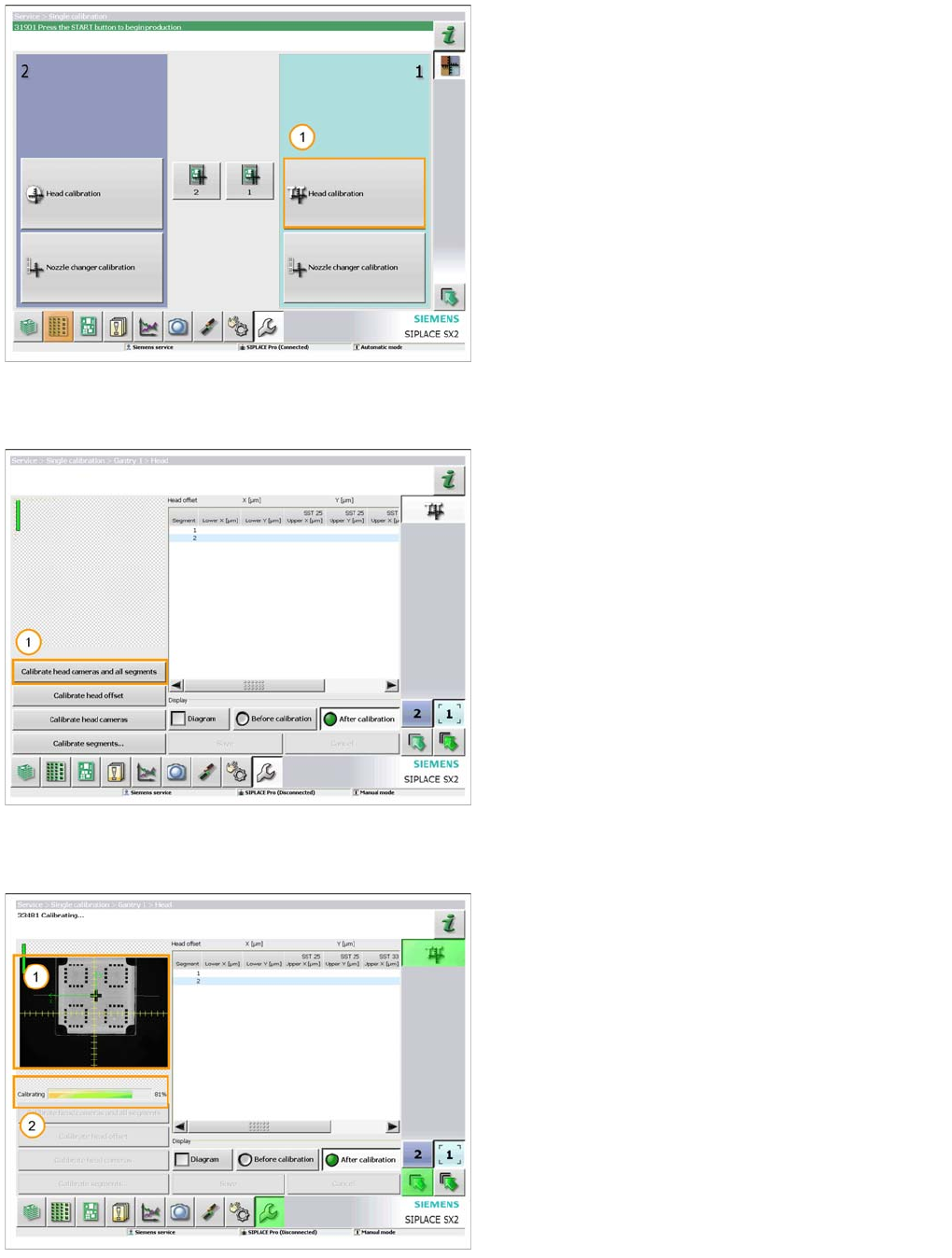 TwinHead Settings Parameter and Calibrations 343 Student Guide SIPLACE X-Serie and X4I SW70x (AL2) Calibratio n Step 2 Calibration Step 2 Calibratio n Step 3 Calibration Step 3 Calibratio n Step 4 Calibration Step 4 1. S…